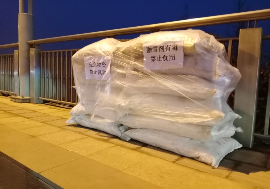 12日28日晚,記者在周口大道橋上看到,橋的兩側(cè)放置了五六堆融雪劑,以應(yīng)對(duì)即將到來(lái)的雨雪天氣,防止橋面結(jié)冰給車(chē)輛和行人造成不便,此舉受到路過(guò)行人一致好評(píng)。