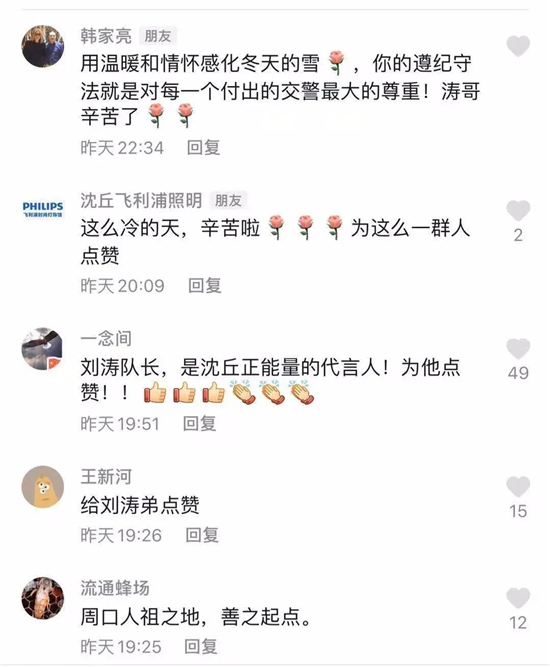 2021年元旦,記者聯(lián)系聯(lián)系上了視頻中的主人公——沈丘縣交警大隊(duì)城市中隊(duì)劉濤中隊(duì)長(zhǎng),雖然是元旦假日,他依然堅(jiān)守在崗位上,他告訴記者,這是一名交警工作的日常,沒(méi)有想到自己和同事們的一個(gè)小舉動(dòng)能獲得無(wú)數(shù)網(wǎng)友好評(píng),這給了他們?cè)谝院蠊ぷ髦懈蟮膭?dòng)力,劉濤表示,風(fēng)雪無(wú)阻,滾滾車流中,他將為全縣人民的安全出行繼續(xù)堅(jiān)守崗位。