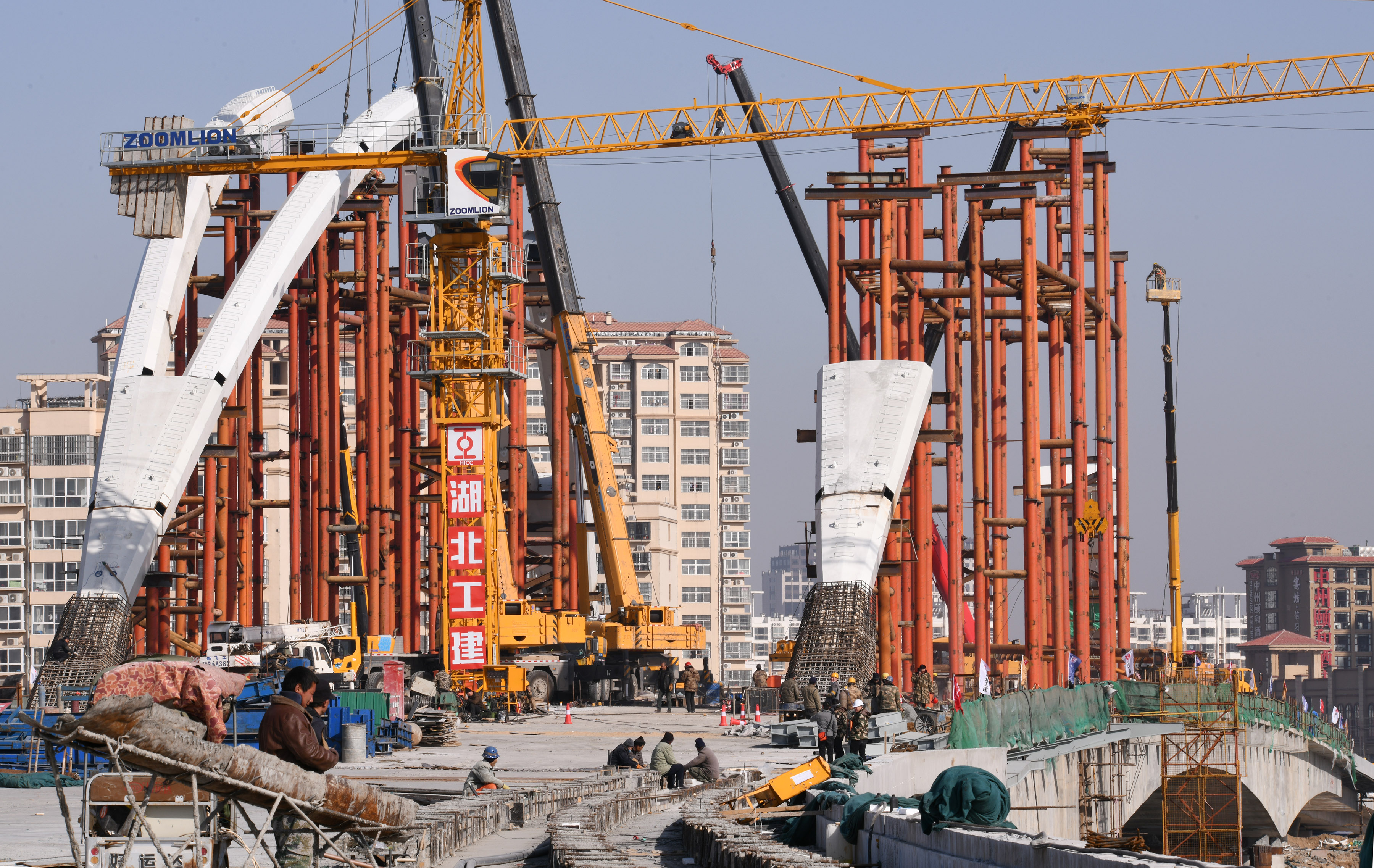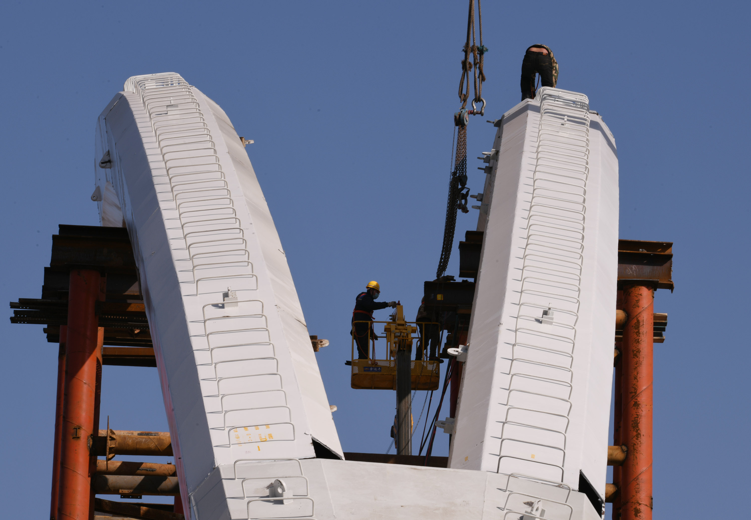 “一輪明月照古城”是中原路跨沙潁河大橋在諸多跨沙潁河大橋中獨(dú)居特色的風(fēng)情。眼下,中原路跨沙潁河大橋合攏之后,橋面建設(shè)處于緊鑼密鼓之中,并開(kāi)始進(jìn)入安裝“月亮”施工階段。記者在施工工地看到,吊車(chē)往來(lái),吊臂上下吊裝著材料,隨著工人們忙碌地焊接、安裝,“月牙”已經(jīng)乍現(xiàn)。