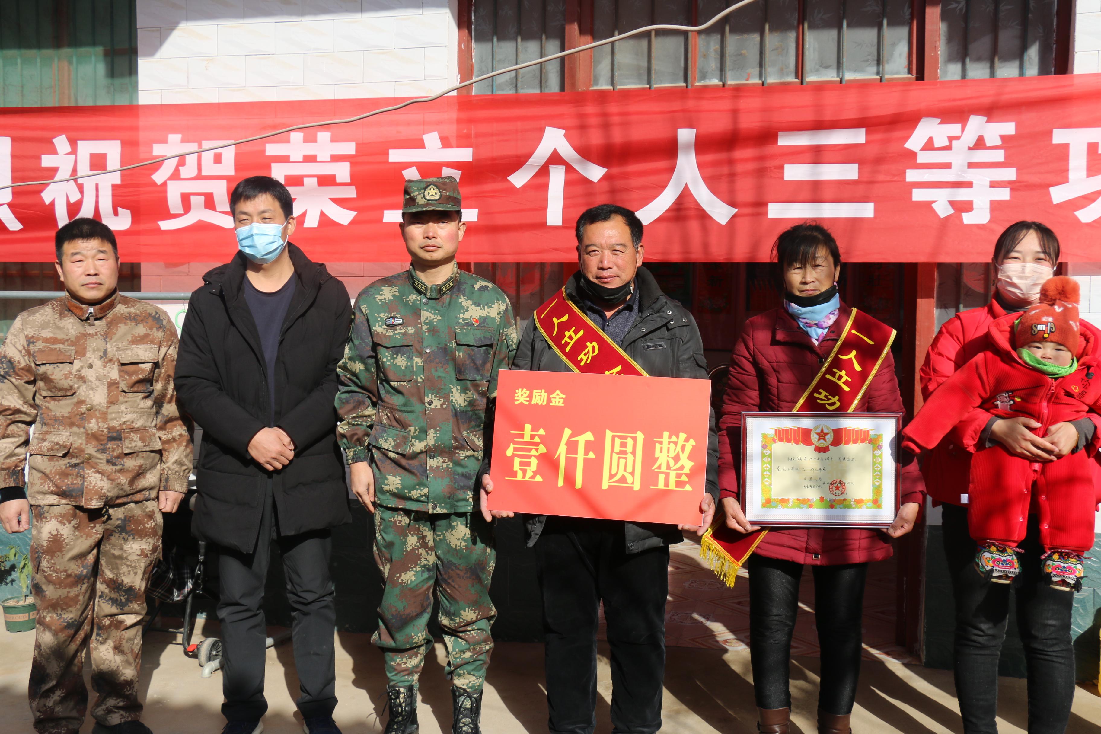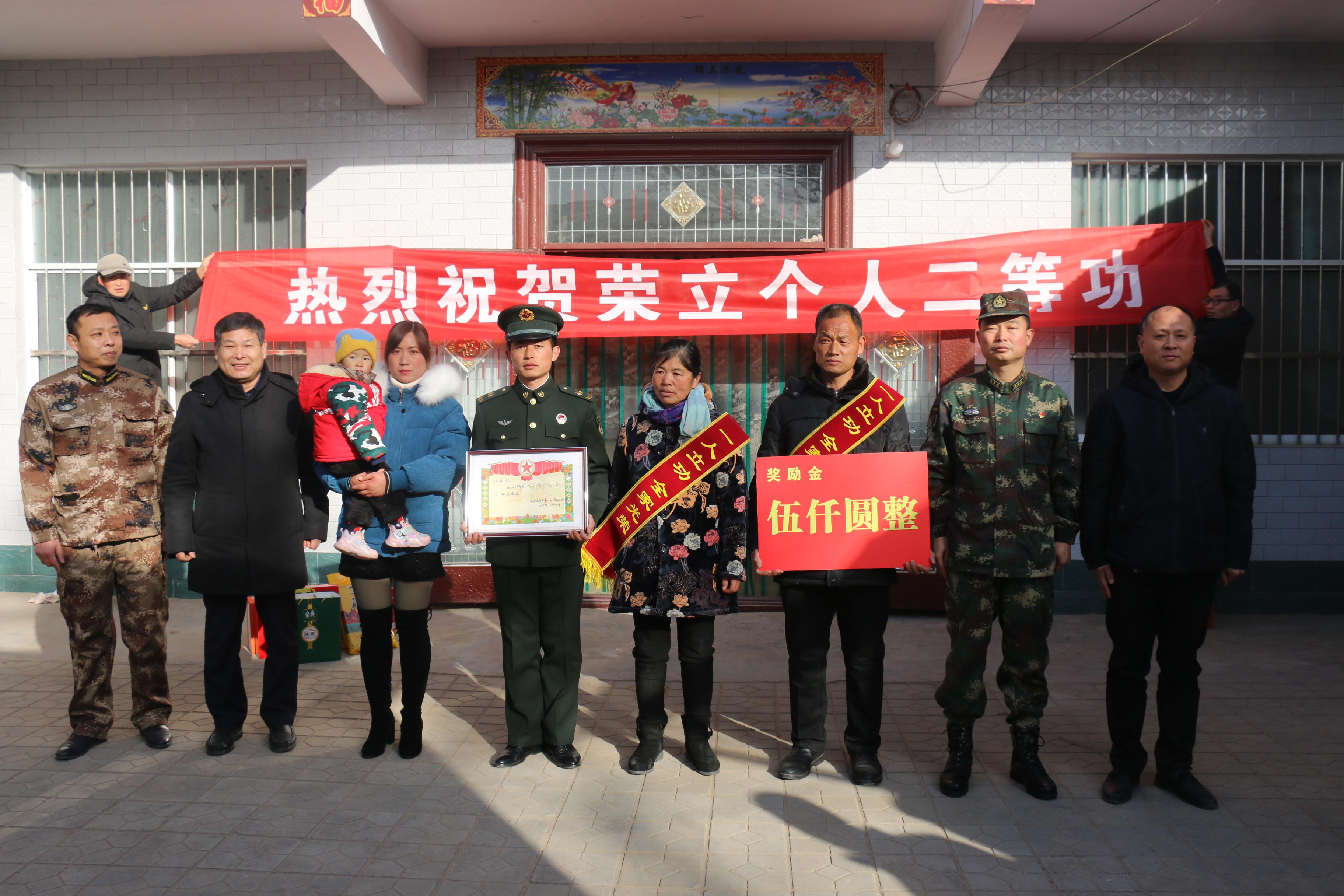 1月12日上午,西華縣西華營鎮(zhèn)雙樓村某部士官高志豪家中鑼鼓喧天,喜氣洋洋。該縣人武部政委涂友佳、縣退役軍人事務局局長龔坤敬一起把二等功喜報和“一人立功,全家光榮”的紅色綬帶及5000元現(xiàn)金等送到高志豪及其父母手中。