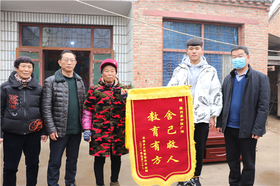 得知張廣坤所在學(xué)校的領(lǐng)導(dǎo)和老師要來村子,被救4歲男孩張子豪的奶奶帶著事先制作的錦旗來到張廣坤家說,原本打算把錦旗送到學(xué)校,感謝陳州高中培養(yǎng)出廣坤這樣的好學(xué)生,是廣坤救了他們?nèi)摇Kf,事發(fā)當(dāng)天下午5時(shí),她在家做晚飯,一不留神,4歲的孫子獨(dú)自抱住球出門跑到村坑塘邊的空地上玩耍去了。玩耍中,孩子不慎將球踢進(jìn)了水塘?!?歲的孩子能懂啥,光想著撈他的皮球,水至脖頸,害怕了哭喊起來。當(dāng)日,附近沒有人,孩子身上又穿著襖,要不是被廣坤及時(shí)發(fā)現(xiàn),俺家的日子以后真沒法過。”講到這,男孩的奶奶直掉眼淚。