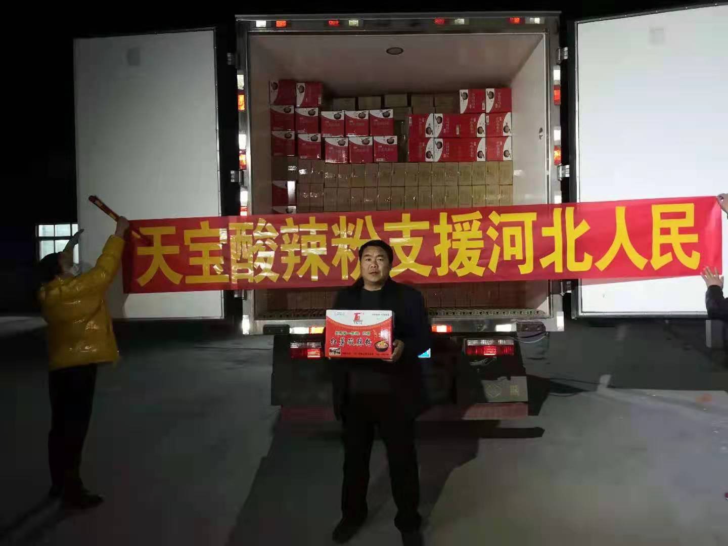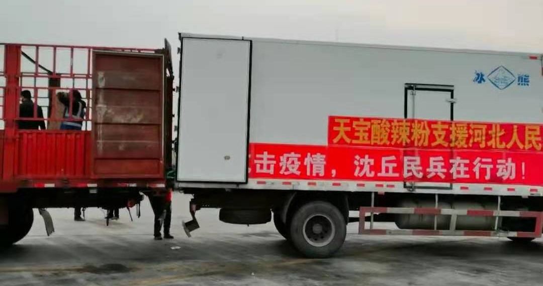 于是,他當(dāng)即與河北省南宮市相關(guān)防疫部門取得聯(lián)系,天宮那邊欣然接受,并表示感謝。1月20日當(dāng)夜,便組織召集村上的“鐵桿工人”連夜加班加點(diǎn)生產(chǎn)了價值5萬元共計1萬盒“天寶酸辣粉”,無償捐贈給河北天宮市,送去來自沈丘縣中豫天寶食品有限公司的一片愛心。