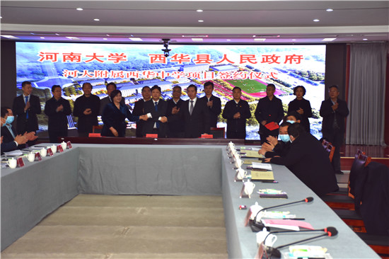 在與會領(lǐng)導(dǎo)的共同見證下,西華縣委副書記、縣長田慶杰與河南大學(xué)黨委常委、副校長許紹康簽訂戰(zhàn)略合作協(xié)議書;西華縣經(jīng)濟(jì)技術(shù)開發(fā)區(qū)管委會主任宋廣良,河南大學(xué)附屬中學(xué)校長蔡建東,河南博遠(yuǎn)教育投資有限公司董事長樊元玲共同簽訂河南大學(xué)附屬西華中學(xué)項目協(xié)議。