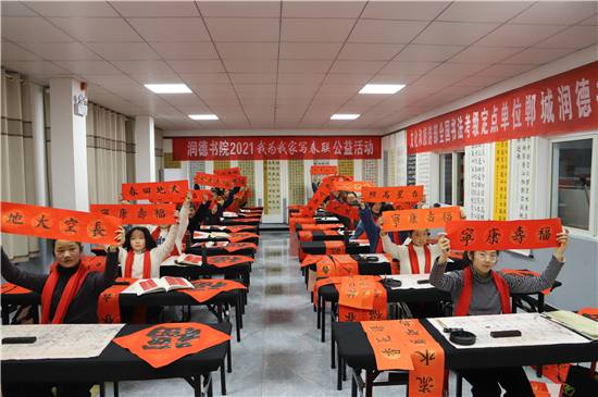 春節(jié)前夕,鄲城縣的書法家和書法愛好者們便更顯活躍,他們進(jìn)機(jī)關(guān)、進(jìn)企業(yè)、進(jìn)社區(qū)、進(jìn)學(xué)校、進(jìn)農(nóng)村,把富有中國(guó)特色的新春祝福,富含中國(guó)傳統(tǒng)文化的春聯(lián),送到千家萬戶。