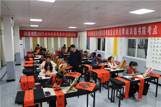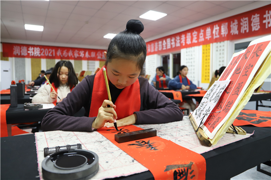 2月3日,記者在鄲城縣潤(rùn)德書院看到,“我為我家寫春聯(lián)”活動(dòng)正緊張地進(jìn)行著,數(shù)十名書法小學(xué)員端坐案前、從容執(zhí)筆、揮毫作書,一個(gè)個(gè)福字工整又靈活,一副副對(duì)聯(lián)娟秀又詩(shī)意。孩子們?cè)谖輧?nèi)全神貫注地寫字,把最美好的祝福用自己的所學(xué)展示給家庭;家長(zhǎng)們?cè)诖巴獾嗄_張望,望子成龍、望女成鳳的心態(tài)表露無遺。