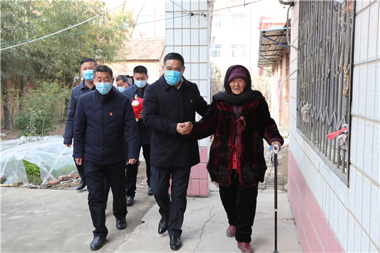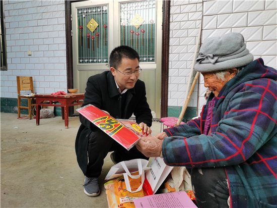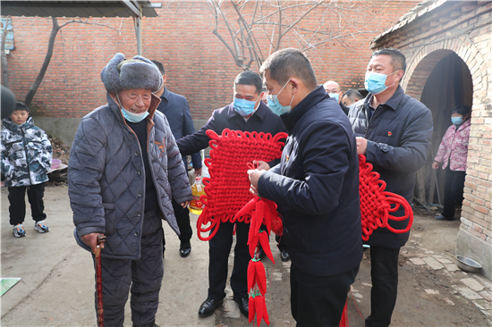 在鄭家集鄉(xiāng)韓樓村,縣農(nóng)商銀行鄭家集支行行長(zhǎng)武繼龍帶領(lǐng)員工來(lái)到92歲韓老漢的家中,看到韓老漢由于身體原因只能靠拐棍佝僂著背站著,武繼龍緊忙彎腰俯下身說(shuō):“大爺,快過(guò)年了,我們來(lái)看看您,提前給您拜個(gè)早年!”“真的是太感謝恁了,這么冷的天,還讓你們來(lái)送到家里面?!表n老漢激動(dòng)地說(shuō)。