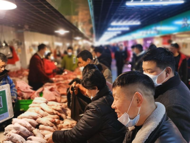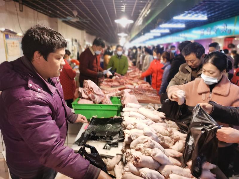 2月10日一大早,位于周口市的最大的黃淮農(nóng)貿(mào)市場(chǎng)里熙熙攘攘,熱鬧豐常,行人小心翼翼地從來往的各式貨車間穿過,客商們被格外熱鬧的攤位吸引,駐足詢價(jià)、了解行情。圖為熱鬧的肉類銷售區(qū)域內(nèi)市民在選購。