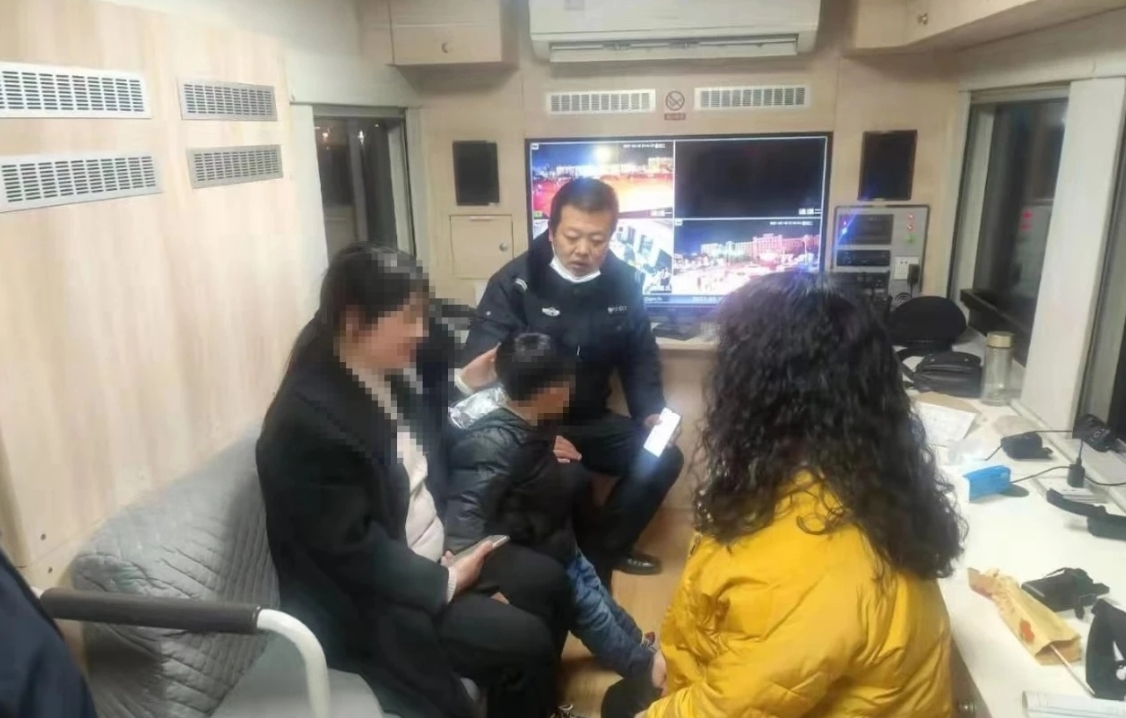 巡特警隊(duì)員開著巡邏車在廣場見人就問,晚10時(shí)許,值勤隊(duì)員終于找到男童的母親,其母親名叫吳曉萌,母子倆得以團(tuán)聚。