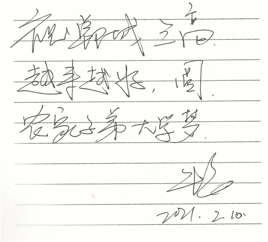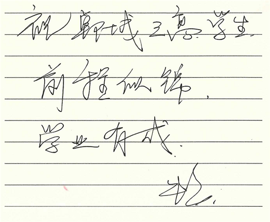 朱婷雖然很少回家,但是一直關(guān)注老家鄲城的發(fā)展變化,特別關(guān)注鄲城的教育發(fā)展,當(dāng)她得知鄲城三高率先提煉出“孝、勤、韌、忠、濟(jì)”為核心的朱婷精神,并把這種精神作為鄲城三高學(xué)子的精神引領(lǐng)時非常感動,為鄲城三高始終堅(jiān)持立德樹人的教育理念而高興,為鄲城三高學(xué)子的拼搏進(jìn)取精神而欣慰,為鄲城三高辦學(xué)成果而點(diǎn)贊,并欣然寫下:“ 祝鄲城三高越來越好,圓農(nóng)家子弟大學(xué)夢;祝鄲城三高學(xué)生前程似錦,學(xué)業(yè)有成?!?/p>