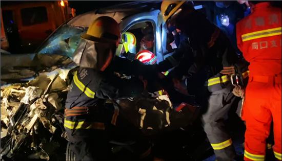 由于面包車內(nèi)有被困人員,需要消防救援人員到達(dá)現(xiàn)場(chǎng)使用專業(yè)破拆工具進(jìn)行救援。示范區(qū)消防大隊(duì)接警后立即調(diào)派2部消防車10名指戰(zhàn)員前往現(xiàn)場(chǎng)。指戰(zhàn)員到達(dá)現(xiàn)場(chǎng)后利用搶險(xiǎn)救援車對(duì)事故車輛進(jìn)行牽引,擴(kuò)大救援空間以便對(duì)被困司機(jī)進(jìn)行施救,同時(shí)利用破拆工具將面包車進(jìn)行破拆便于解救被困小女孩,當(dāng)晚8時(shí)39分,兩人被救出并移交于醫(yī)護(hù)人員接受進(jìn)一步治療。③5