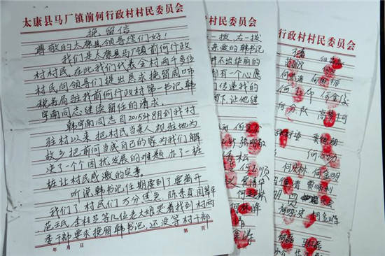 2018年,組織上考慮到韓宇南已經(jīng)在第一書記的崗位上工作了3年多,決定換他回原單位工作。前何村的群眾聽到這個消息后,多次前往馬廠鎮(zhèn)政府請?jiān)福罅粝马n宇南繼續(xù)擔(dān)任前河村支部書記,何心功等99位村民還向國家稅務(wù)總局周口市稅務(wù)局、太康縣委縣政府寫了一封“挽留信”,并按下了99個鮮紅的手印。