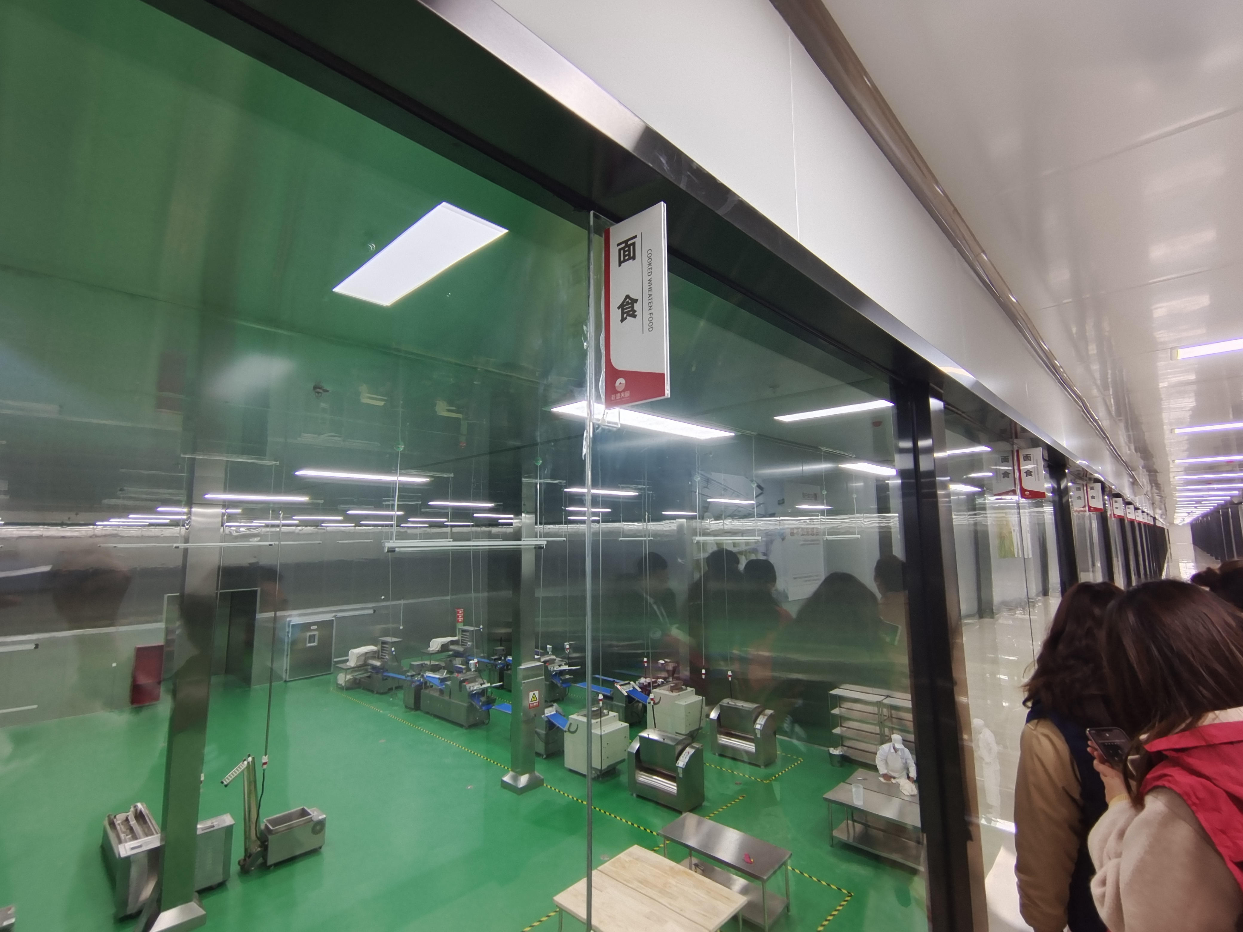 在位于川匯區(qū)女媧路88號(hào)的乾盛央廚,直播團(tuán)隊(duì)用圖文形式實(shí)時(shí)現(xiàn)場(chǎng)呈現(xiàn)午餐制作整體環(huán)境。隔著參觀走廊上的玻璃,全線開機(jī)一小時(shí)能出12000個(gè)無(wú)添加饅頭的面食車間,從生米到熟飯全自動(dòng)機(jī)械化制作的米飯車間,全程紫外線消毒、菜品全清真的烹飪車間,流水線上分盒分箱并與物流區(qū)無(wú)縫銜接的分餐生產(chǎn)線,這些在主播與乾盛央廚工作人員的一問一答中呈現(xiàn)在觀看直播的家長(zhǎng)朋友們面前。“我們不僅做飯,餐具也由我們提供,餐具是PPP材料,耐高溫,安全無(wú)毒,筷子、勺子是不銹鋼的?!惫ぷ魅藛T介紹。
