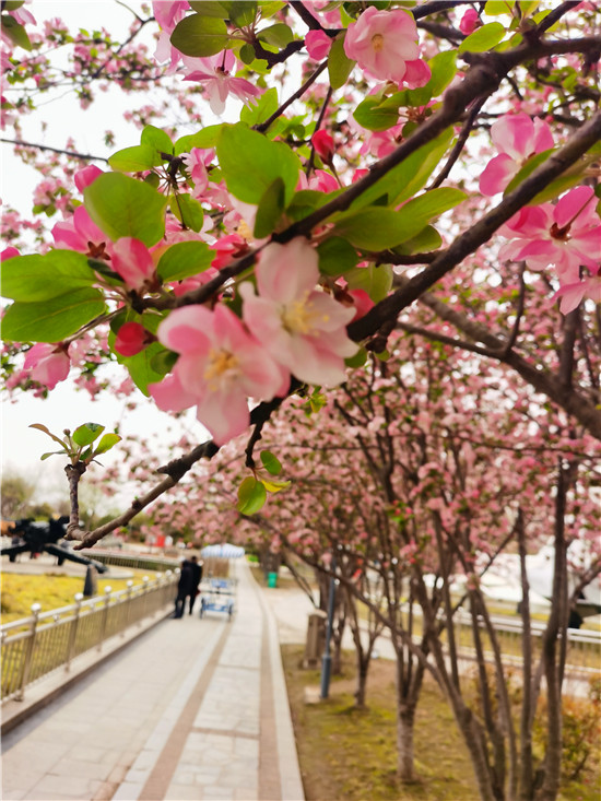 日前,周口公園里的海棠紛紛綻放。在公園內的道路上,海棠已進入盛花期,粉色的花朵如夢似幻,令人沉醉。