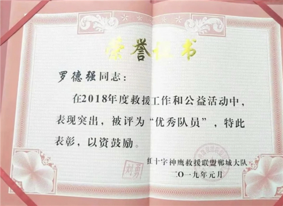鄲城縣神鷹救援隊隊長劉勇說,正是看到了羅德強(qiáng)的優(yōu)秀品質(zhì),2018年將羅德強(qiáng)吸納為神鷹救援隊員?!吧聱椌仍?lián)盟鄲城大隊隸屬于中國神鷹救援隊,由各個行業(yè)的志愿者組成,也是河南省成立最早的一支民間救援隊,除參加全國各地災(zāi)后救援活動外,日常積極參加社會志愿者活動。”“我一個人的力量很有限,加入這個優(yōu)秀集體,能夠?qū)W到更多專業(yè)救援知識,從而幫助更多的人,我感到非常驕傲和自豪?!绷_德強(qiáng)說。2019年8月10日,受第九號臺風(fēng)“利奇馬”影響,山東省壽光市、東營市等部分地區(qū)遭受洪災(zāi)。8月11日晚上,紅十字神鷹救援聯(lián)盟鄲城大隊趕赴山東壽光救災(zāi)。面對洪災(zāi),羅德強(qiáng)和其他救援隊員不畏辛苦,劃船深入各個受災(zāi)鄉(xiāng)村救助被困群眾。壽光市一鄉(xiāng)鎮(zhèn)3處大閘因斷電出現(xiàn)險情,需要人力進(jìn)行開閘泄洪。羅德強(qiáng)和隊員冒險攀爬到大閘上進(jìn)行人工作業(yè),經(jīng)過3個多小時的奮戰(zhàn),3處大閘全部打開,安全泄洪。2019年9月1日,參加泳渡日月潭返程途中,羅德強(qiáng)在福建高速公路上,發(fā)現(xiàn)前方車輛發(fā)生車禍,一名司機(jī)腿部骨折、血流不止。他立即下車和司機(jī)溝通,一邊報警,一邊利用專業(yè)救援知識打開變形的車門,順利將司機(jī)救出?!坝捎谶^度驚嚇,司機(jī)以骨折為由拒絕下車。當(dāng)我告訴司機(jī)自己是神鷹救援隊員、救援技術(shù)過硬后,才同意我們施救?!碑?dāng)時高速上車流密集,情況十分危險,如果司機(jī)不能及時救出,后果不堪設(shè)想?!拔覀冘囕v加油、住宿、吃飯等救援費(fèi)用都是隊員AA制負(fù)擔(dān),從來不給當(dāng)?shù)卣蚓戎颂砣魏温闊?。?/p>