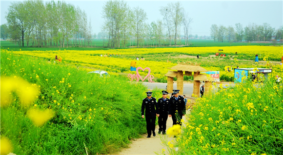4月10日上午,商水縣公安局組織民警在鄧城鎮(zhèn)6000多畝油菜花海中執(zhí)勤巡邏,疏導(dǎo)交通,確保游客安全。當(dāng)日,商水縣首屆金色花田樂游匯暨農(nóng)特產(chǎn)品展銷會(huì)開幕式在此舉行。來(lái)自市內(nèi)外的數(shù)萬(wàn)名游客到這里踏青賞春。