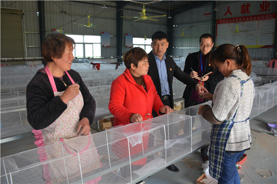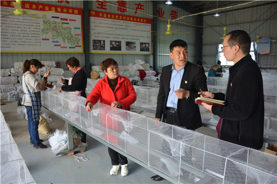 4月11日,商水縣平店鄉(xiāng)大朱莊村扶貧車間里留守女工正在編織漁網(wǎng)。該縣各級紀(jì)檢部門切實(shí)加強(qiáng)對扶貧資金資產(chǎn)的監(jiān)督管理,確保了扶貧項(xiàng)目產(chǎn)業(yè)正常運(yùn)行,有效促進(jìn)了廣大留守婦女家門口就業(yè)增收。圖為縣鄉(xiāng)紀(jì)委干部在扶貧車間調(diào)查了解資產(chǎn)管理群眾收益工人收入等情況。