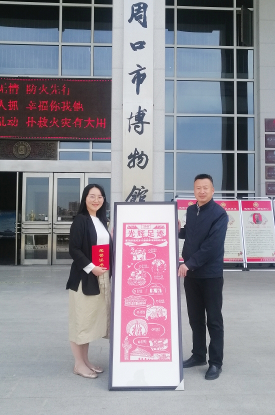 4月28日,河南科技職業(yè)大學(xué)老師范文華來到周口市博物館,將自己的剪紙作品“光輝足跡”捐贈給周口市博物館,在建黨100周年之際,表達一位教育工作者的殷殷之情。周口市博物館館長周建山向其頒發(fā)榮譽證書。