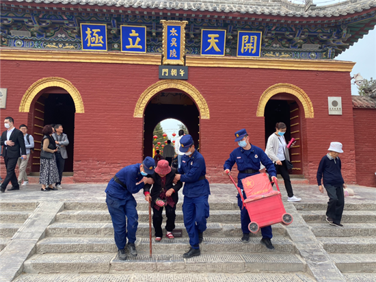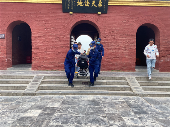 統(tǒng)天殿前一名老人步履蹣跚,正在殿前廣場巡檢的前置執(zhí)勤點(diǎn)消防人員迅速向前,接過手提袋,小心翼翼地?cái)v扶老人走上臺階跨過門檻……而這,僅僅是“五一”假期太昊陵景區(qū)消防人員緊急幫助游客的一個場景。在各景區(qū),隨處可見“火焰藍(lán)”的身影,他們堅(jiān)守一線執(zhí)勤崗位,疏導(dǎo)人流、定點(diǎn)警戒,想群眾之所想、急群眾之所急,舍小家為大家。