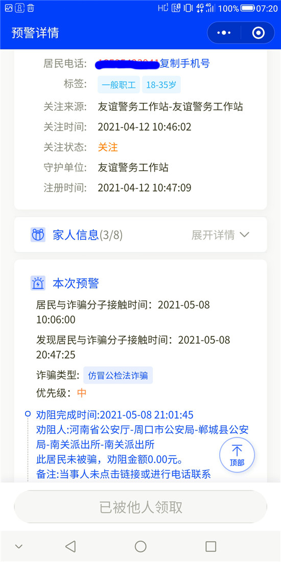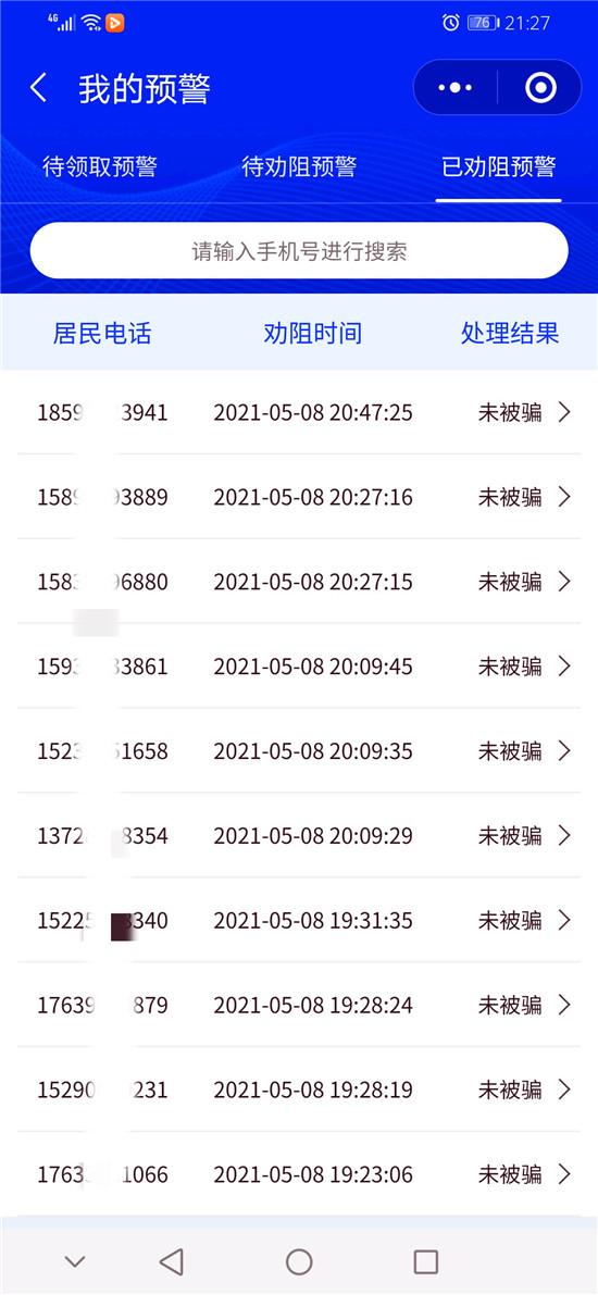 截至目前,洺南街道“金鐘罩”反詐預(yù)警系統(tǒng)注冊人數(shù)達(dá)21929人,受保護(hù)居民29547人,成功勸阻155人次免受電信網(wǎng)絡(luò)詐騙,取得了良好的社會效果。①9