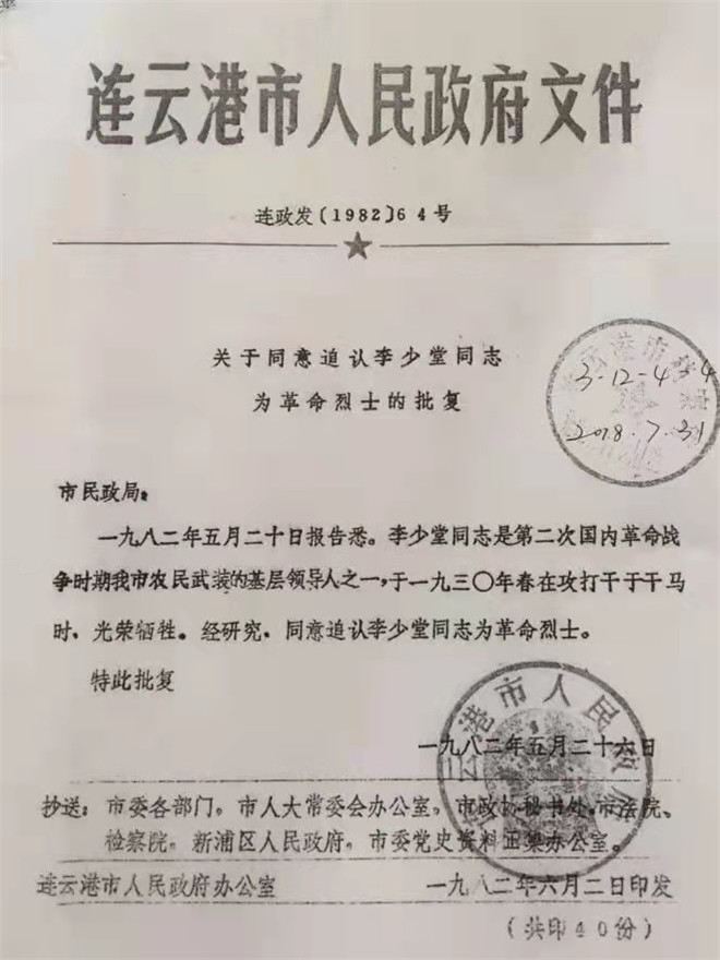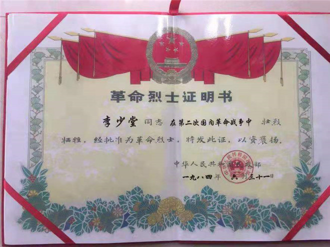 新中國成立后,李少堂的孫子才聯(lián)系上了李少堂曾經(jīng)的革命戰(zhàn)友惠浴宇同志。時任江蘇省省長的惠浴宇同志得知消息后,親寫證明遞交黨中央,這才證實了李少堂的身份。