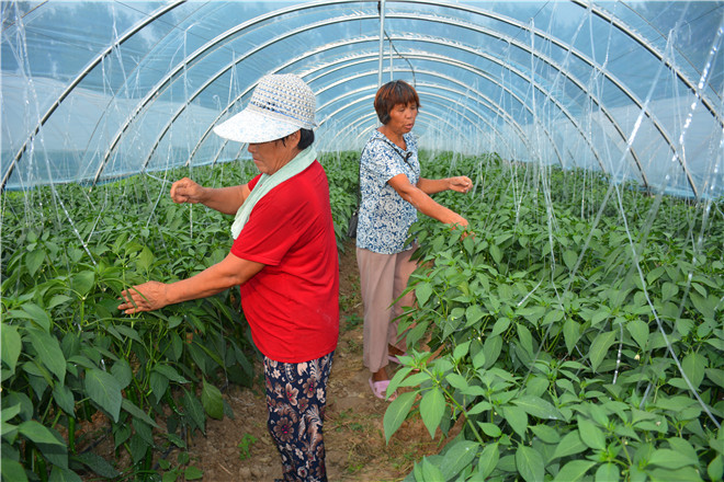 圖二:7月13日, 合作社社員正在管理、查看韓國(guó)“美人椒”。