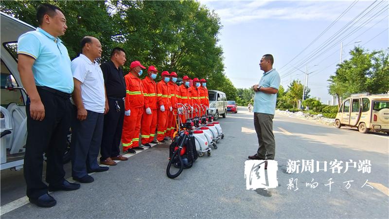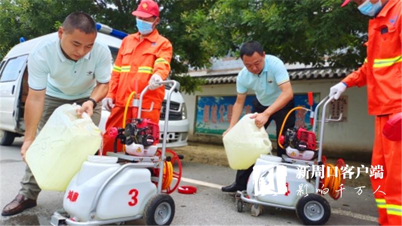 “老關(guān),你們?nèi)膫€人去女媧景區(qū)消殺。老王,老溫你們兩個人去村莊消殺,尤其是旮旯處、垃圾堆、屋后等隱蔽重點區(qū)域一定消殺徹底,不留空白。在村莊內(nèi)進行消殺時,一定要和群眾交代好防疫消毒時的注意事項。”7月30日9時許,來自廣州市鴻鷹害蟲防治服務(wù)有限公司周口分公司的10多名愛心人士載著4臺機動手推式滯留噴霧機、1臺電動背負式超低容量噴霧機、1臺大型車載式超低容量噴霧機和230公斤消毒劑,來到西華聶堆鎮(zhèn)思都崗村后,該公司負責(zé)人許金山就向工作人員一一分配消殺任務(wù)。