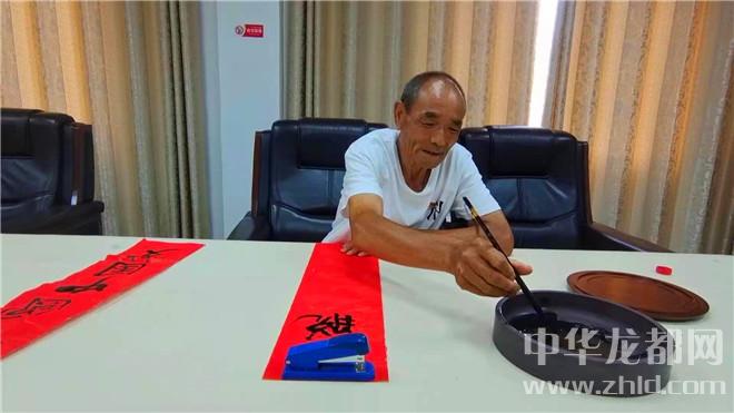 紅色經(jīng)典創(chuàng)作室內(nèi),紅紙精裁,研墨蘸筆。朱再靈與另外兩名黨員商量,一番構(gòu)思后,他揮毫寫下“跟著共產(chǎn)黨共圓中國夢 脫貧致富路齊心奔小康”,筆力蒼勁,對黨的深情浸透其中。