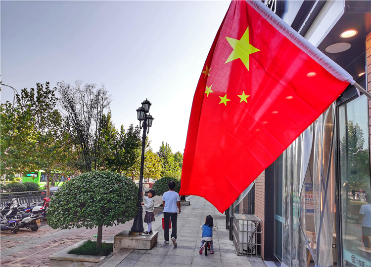 9月30日,市區(qū)臨街商鋪門前五星紅旗隨處可見,紅旗隨風(fēng)飄揚(yáng),將街道裝扮一新,喜迎國慶節(jié)的到來