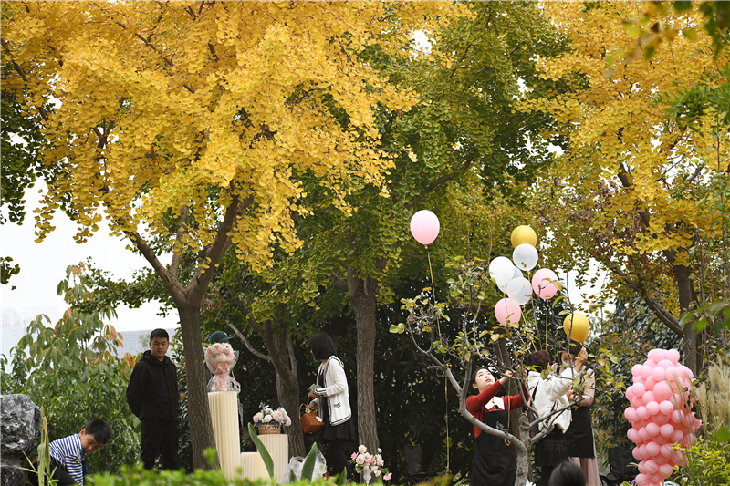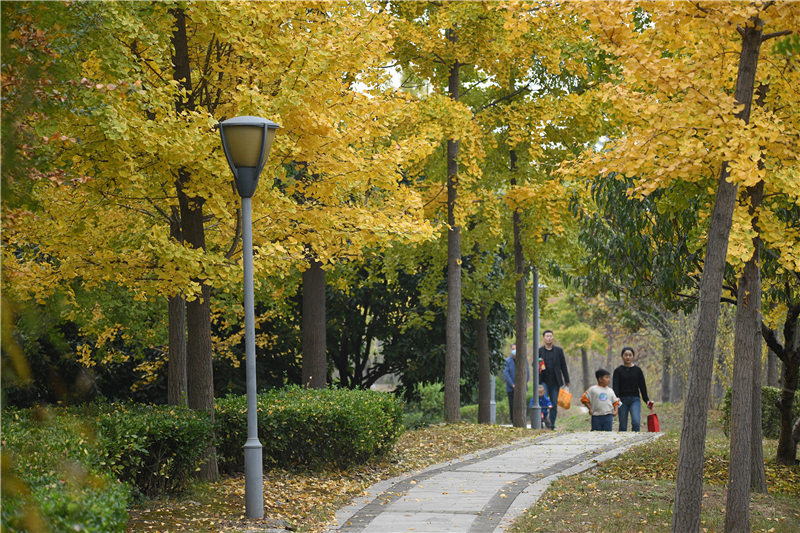 10月31日下午,周口公園的銀杏樹滿樹金黃、披金溢彩,在斑駁的綠樹、紅葉之間,格外美麗,吸引著周末休閑的居民們觀賞游玩。