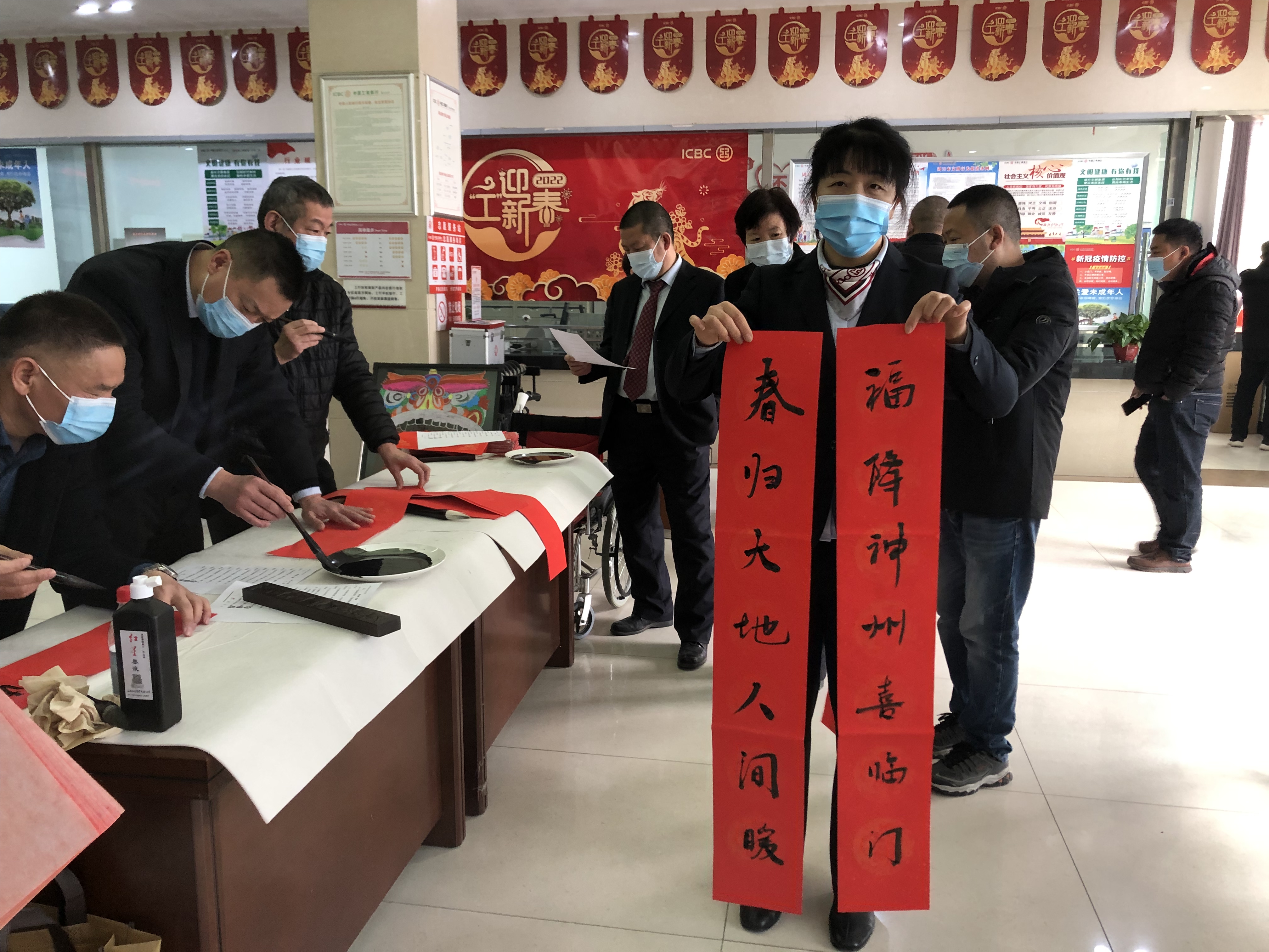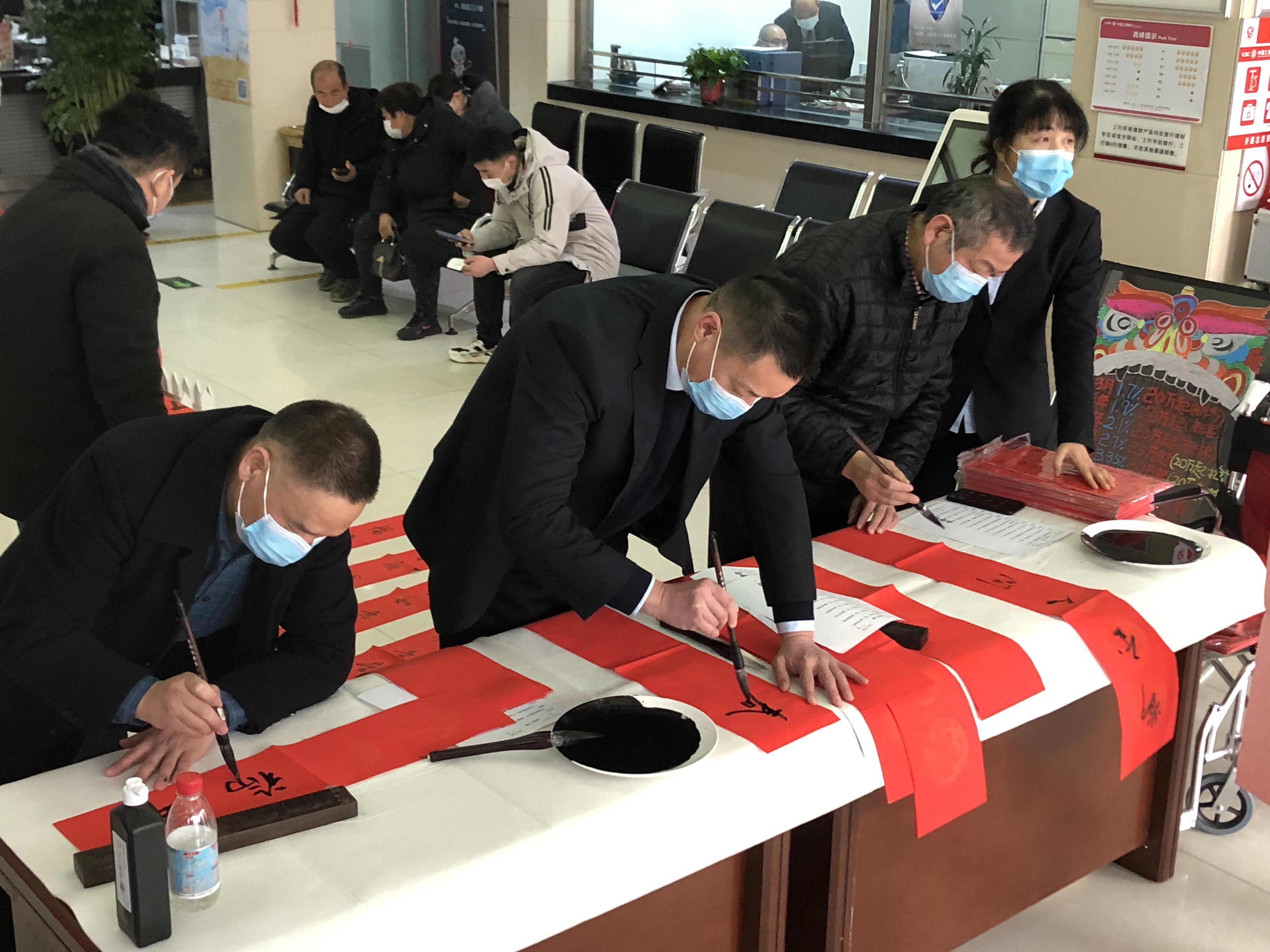 春節(jié)臨近,工行周口分行開展“寫春聯(lián)送福字”活動,精心組織本行書法協(xié)會會員分赴基層網(wǎng)點(diǎn),在營業(yè)廳堂揮毫潑墨,為客戶寫春聯(lián)、送福字。把一幅幅盛贊祖國昌盛、人民安居樂業(yè)、新春祝福送給客戶。此次活動,該行共計為客戶送出春聯(lián)1300余幅,受到廣大客戶的稱贊。 李玉 攝①2