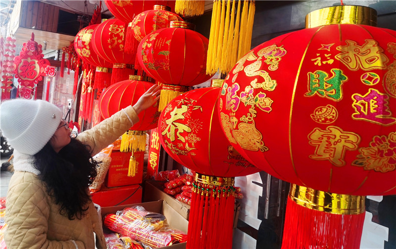1月27日,市民在認(rèn)真挑選著新年的裝飾品。春節(jié)臨近,虎年生肖飾品、對聯(lián)、中國結(jié)、福字、大紅燈籠等“紅色年貨”火了年貨市場。據(jù)了解,各種寓意祥和的春聯(lián)、以老虎為主題的各種窗花、各種飾品最受市民歡迎。③10