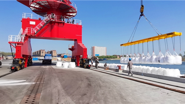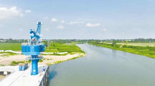 盛夏七月,在項(xiàng)城市東部的項(xiàng)城港,幾架“高聳入云”的新式固定式起重機(jī)的主體已安裝完畢,剩余的部件堆放在地上,巨大的框架和鮮紅的涂裝展示著它們的力量。一側(cè),千噸級貨輪正??吭陂L長的泊位前,起重機(jī)緩緩卸下貨艙內(nèi)的散貨。