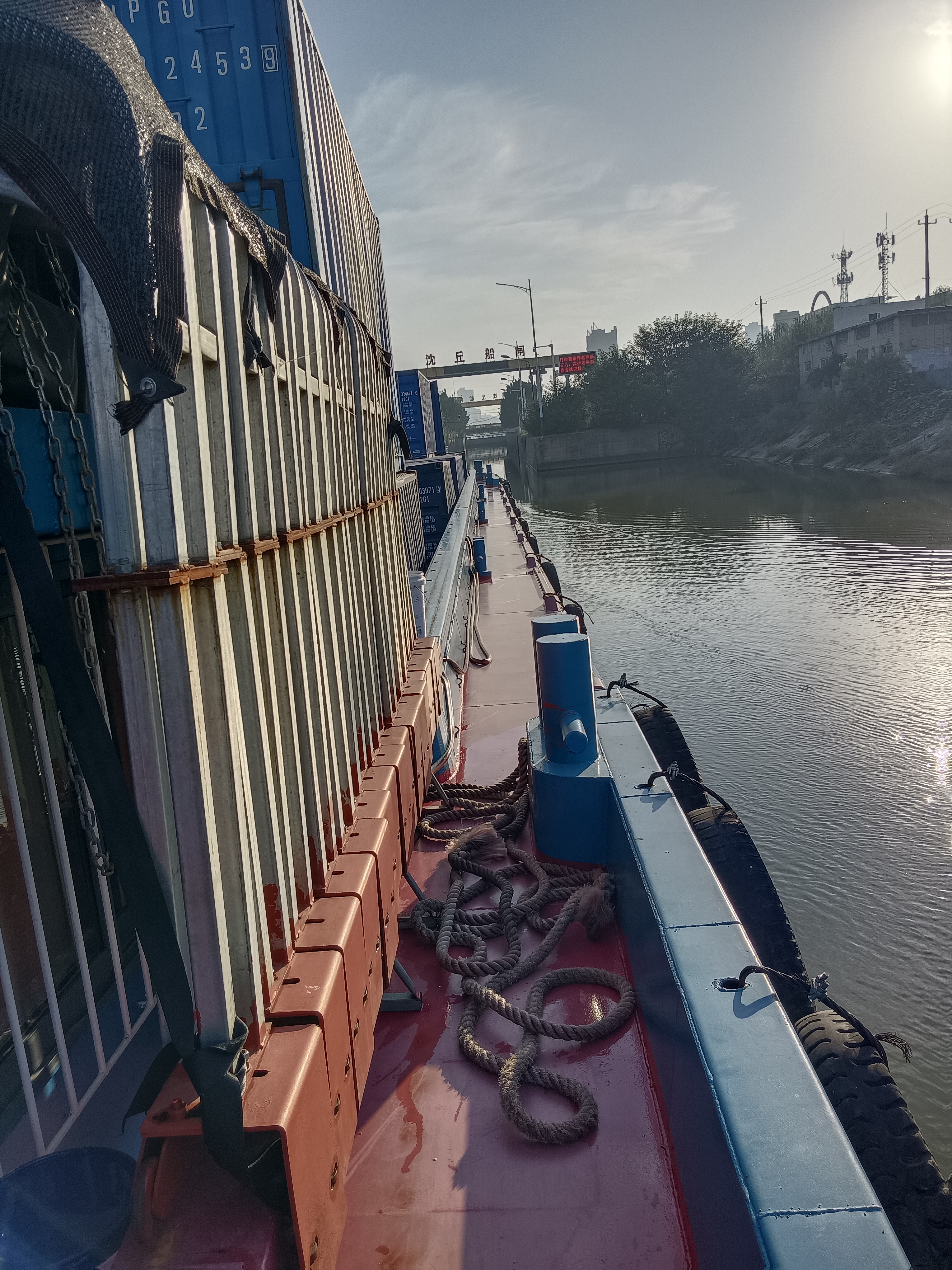 9月25日傍晚,船老大董海軍吊裝好了36個集裝箱,從項(xiàng)城港啟航了。他運(yùn)送的貨物是純堿,生產(chǎn)玻璃的原材料,目的地是安徽鳳陽港。這次,記者一行從水路出發(fā),隨行采訪。