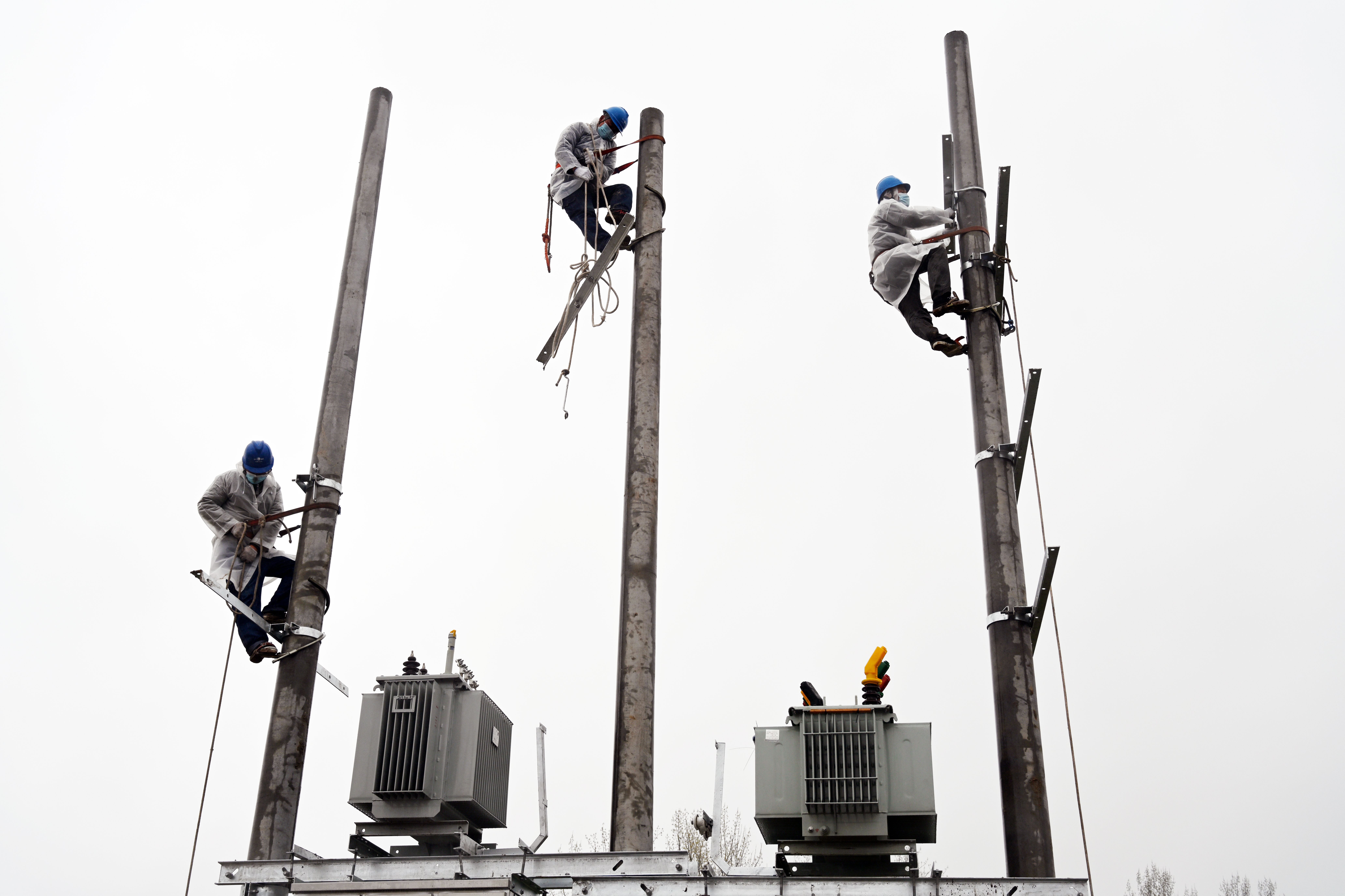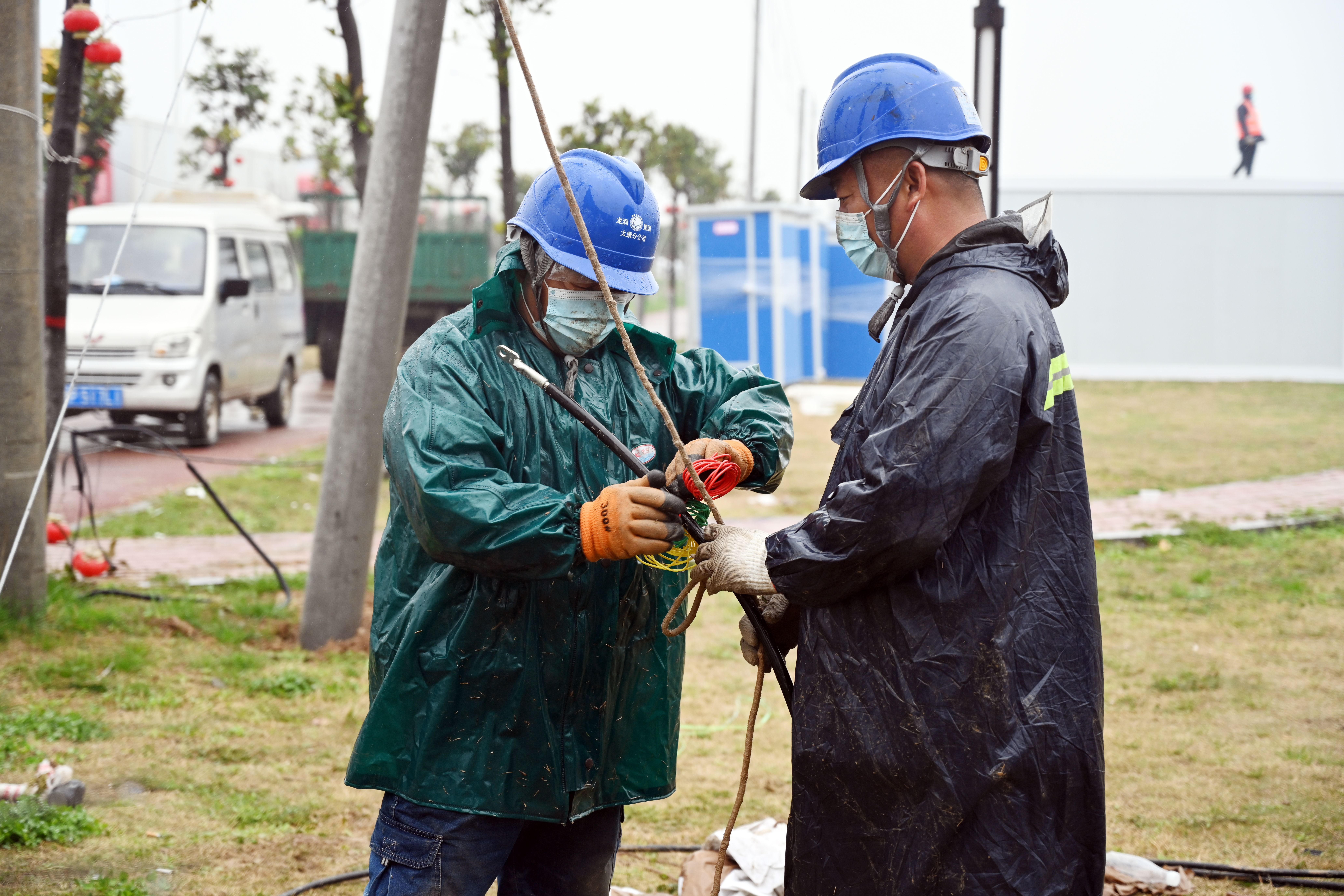 3月25日,在太康縣北環(huán)路核酸檢測(cè)方艙和隔離方艙建設(shè)現(xiàn)場(chǎng),國(guó)網(wǎng)太康縣供電公司工作人員正冒雨施工為其提供電力保障。