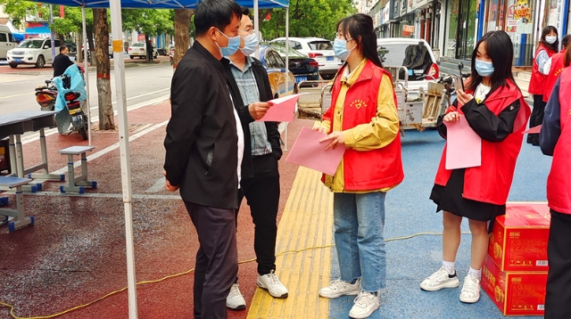 4月29日,商水團(tuán)縣委組織30余名志愿者向沿街商戶宣傳疫情防控政策,提醒沿街商鋪商家落實(shí)好掃“兩碼”、測(cè)體溫、出入登記等各項(xiàng)疫情防控措施。