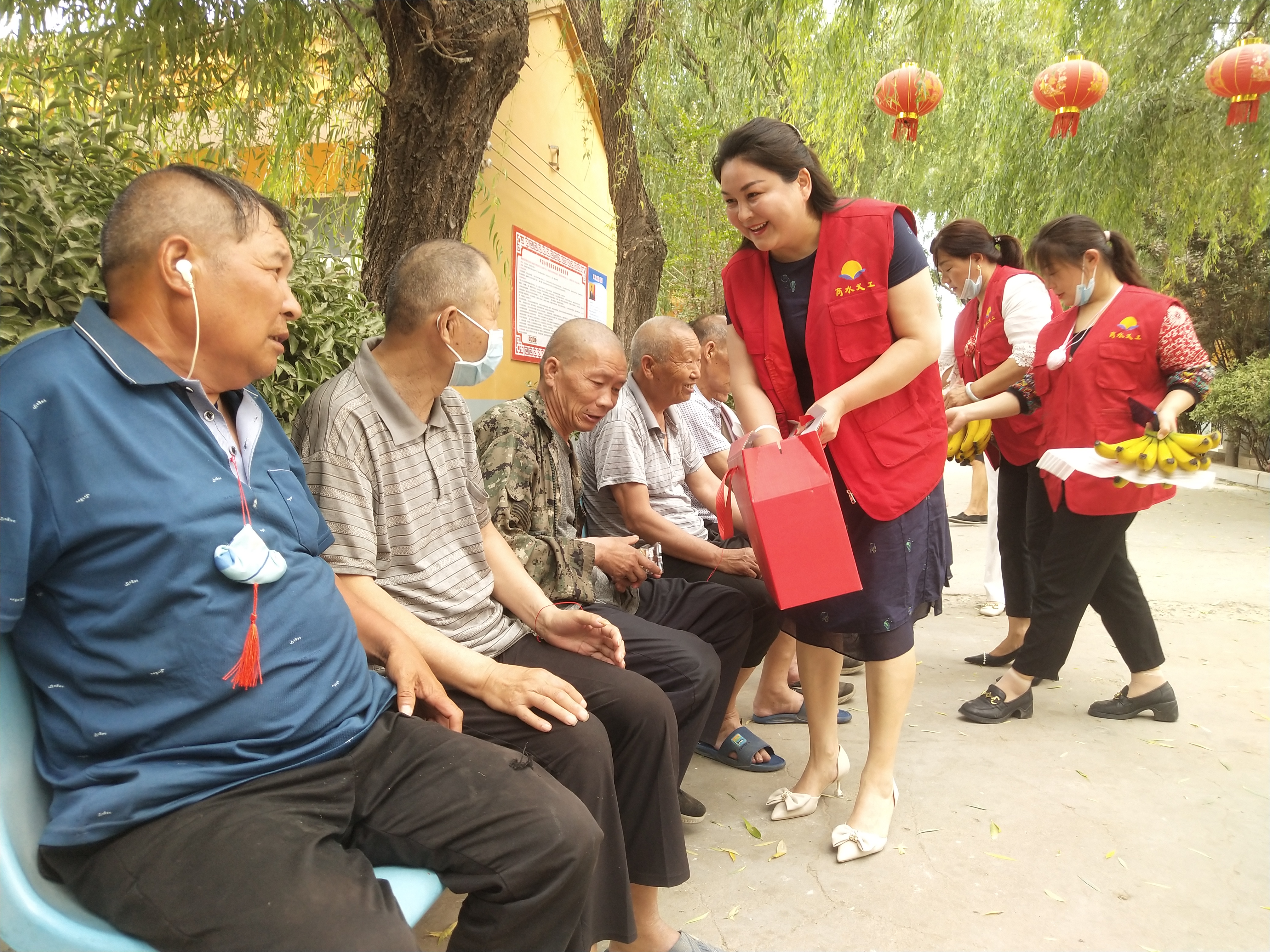 “大爺,大娘,來吃水果,我把香包給您戴上,祝您端午安康,健康長壽......”劉玉英委托的愛心志愿者戚素華、劉影、袁鳳蓮、李霞、姚君英、李艷紅、王香清等還給敬老院的老人送來了粽子、水果,和老人聊天交談、佩戴香包,老人們臉上綻開了幸福的笑容。