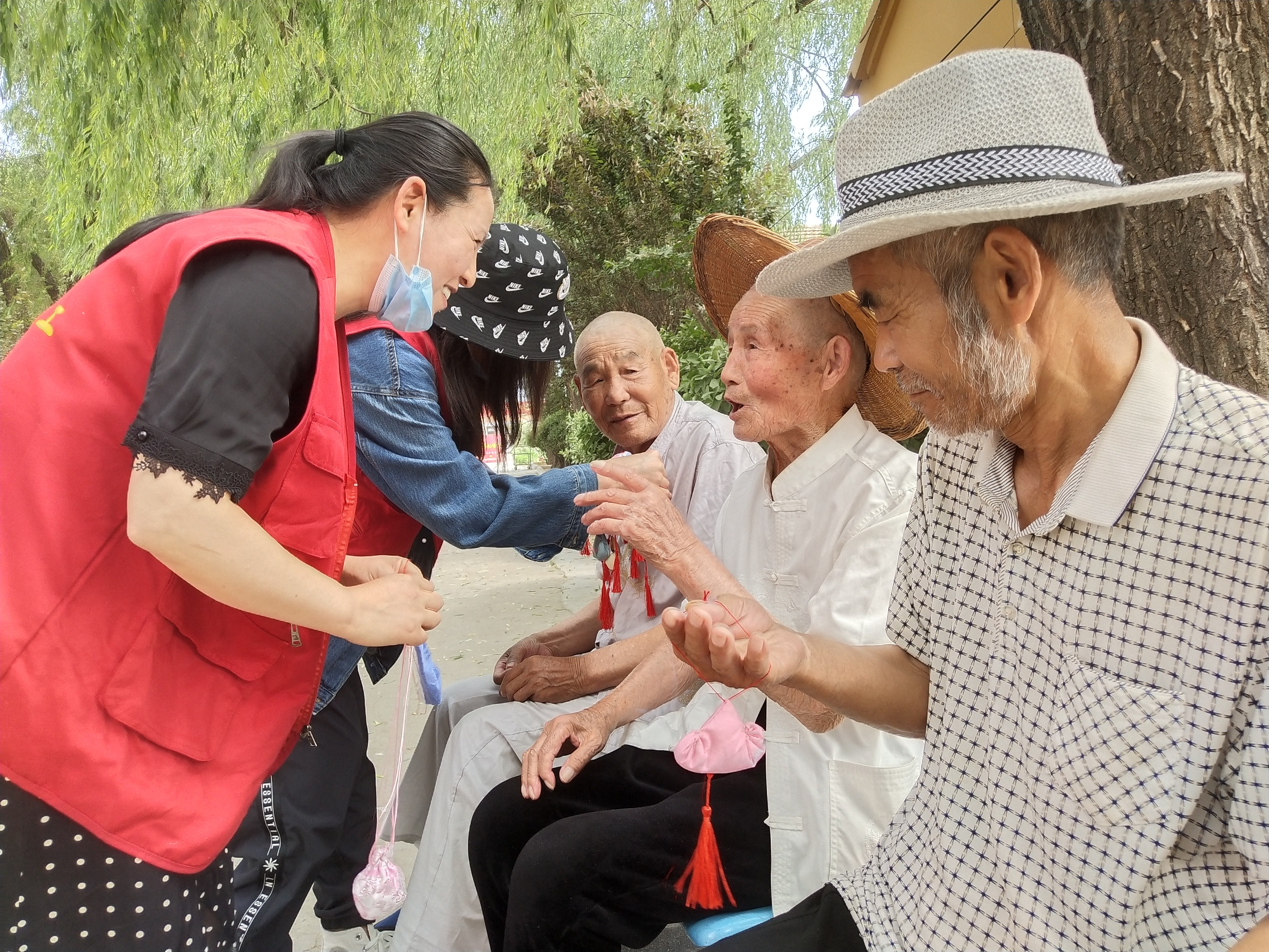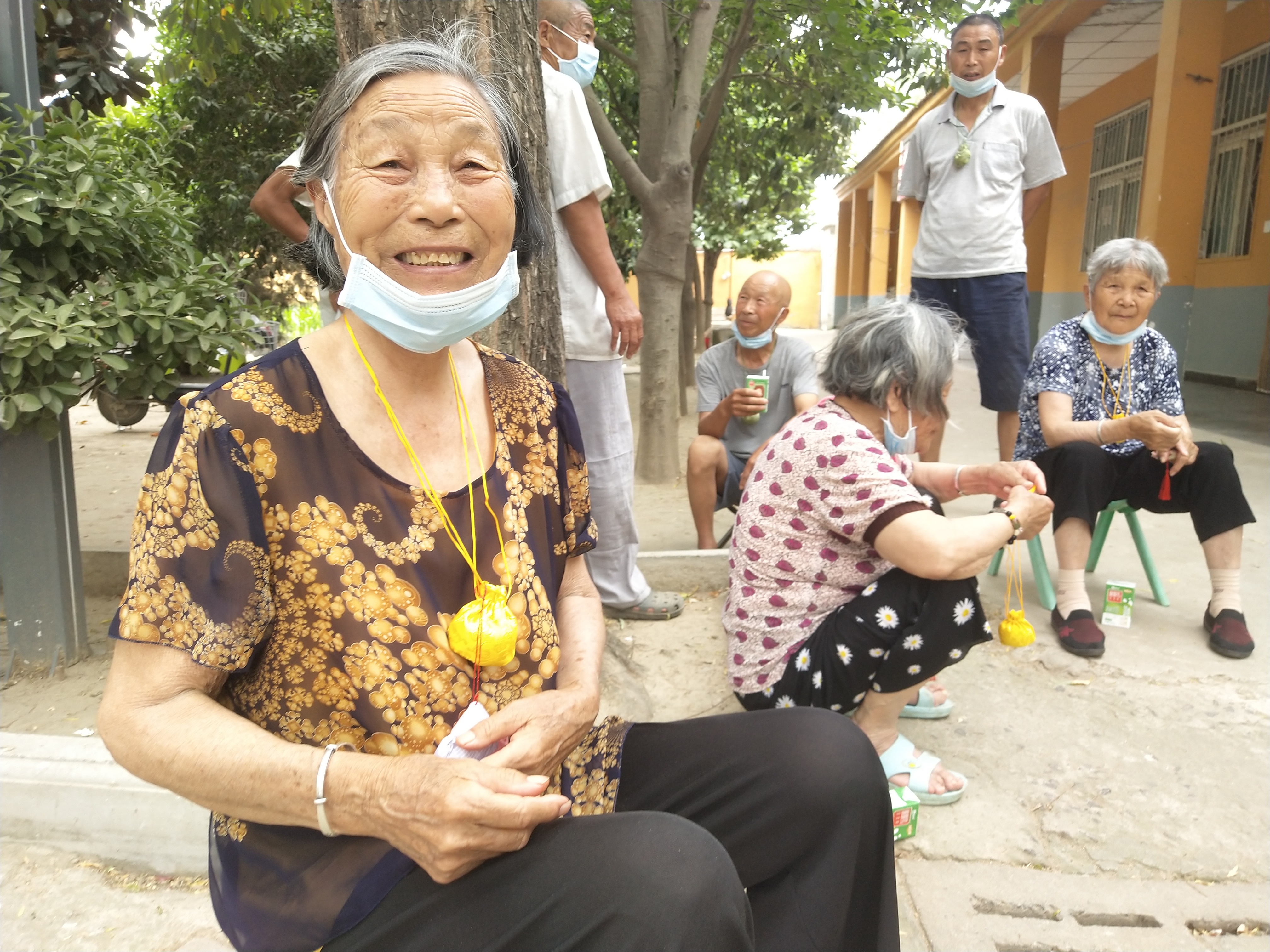 “來,來,來,這是玉英從江蘇省南通市給咱郵寄過來的香包,今天過節(jié)哩,大家每人帶上一個(gè),祝愿大家胸前飄香,端午安康!”