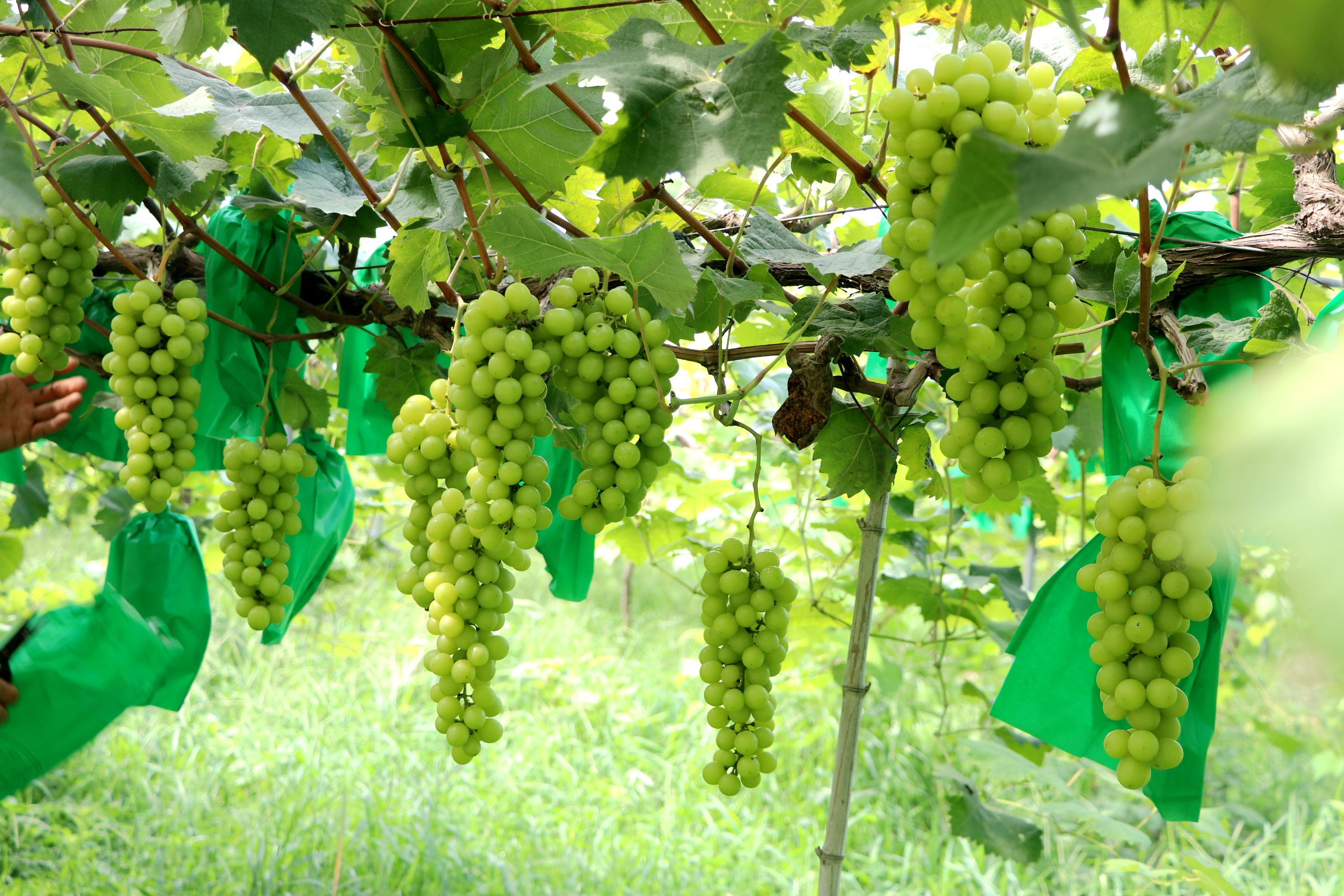 一串一串的葡萄從葉子縫中垂下來。綠色的像翡翠,紫色的像瑪瑙,美麗極了。