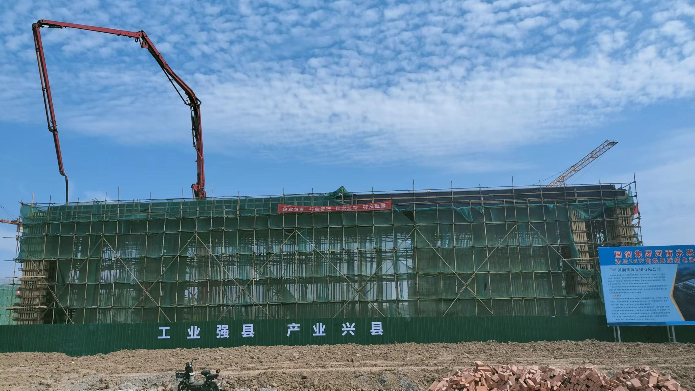 離開(kāi)標(biāo)準(zhǔn)化廠房建設(shè)工地,記者又來(lái)到位于沈丘縣現(xiàn)代科技產(chǎn)業(yè)園內(nèi)的河南未來(lái)新能源沈丘2GW高效異質(zhì)結(jié)(HJT)電池綠色智能制造項(xiàng)目工地,那里也是塔吊林立,一片繁忙景象。高端電池生產(chǎn)車(chē)間正在緊張施工中,一臺(tái)灌漿機(jī)正在澆筑房頂。項(xiàng)目部負(fù)責(zé)人張旭輝說(shuō):“正在建設(shè)的是高端太陽(yáng)能芯片生產(chǎn)車(chē)間主廠房面積2.41萬(wàn)平方米,鋼架5200平方米,10月底完工,11月份安裝設(shè)備?!?/p>