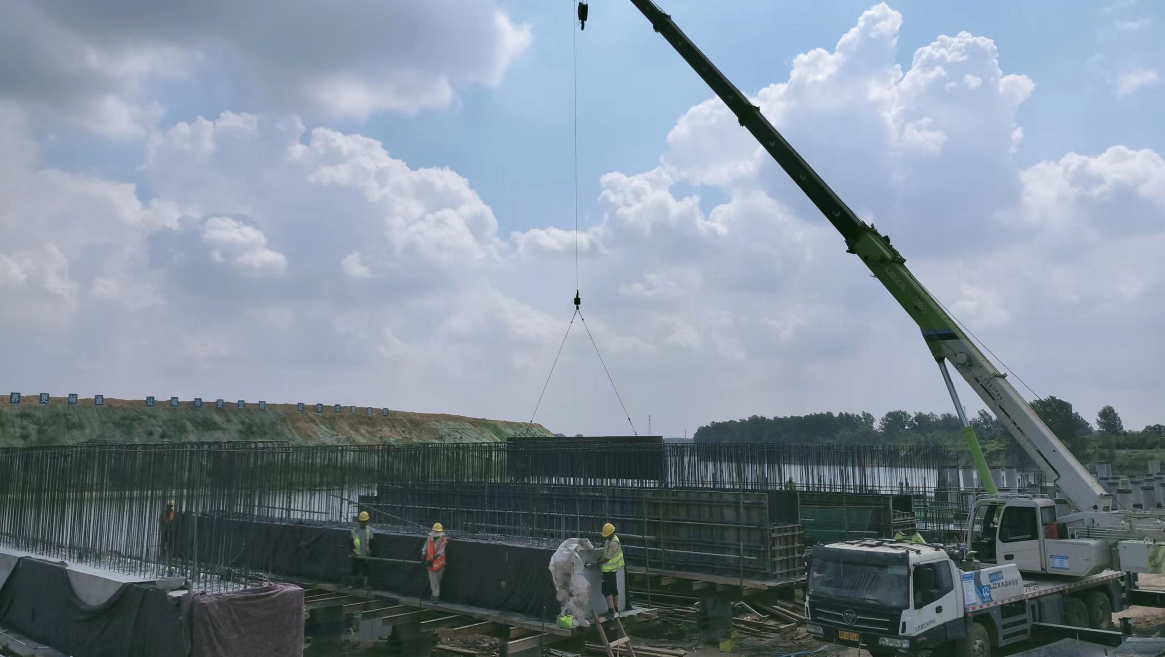 “由于工程進(jìn)度快,我們要在這兒時(shí)刻緊盯住,質(zhì)量上不能出現(xiàn)任何問(wèn)題。”在周鋼碼頭建設(shè)工地上,只見(jiàn)一根根粗壯的停泊位專用水泥柱整齊地排列在沙潁河岸邊,高大的塔吊正在向上面吊裝預(yù)制板,工人們?cè)诟叽蟮哪_手架上工作著,一個(gè)新型專用碼頭已見(jiàn)雛形。馬工程師和幾名工程技術(shù)人員在作業(yè)區(qū)不停地巡視著,巡視間隙,他對(duì)記者說(shuō)。
