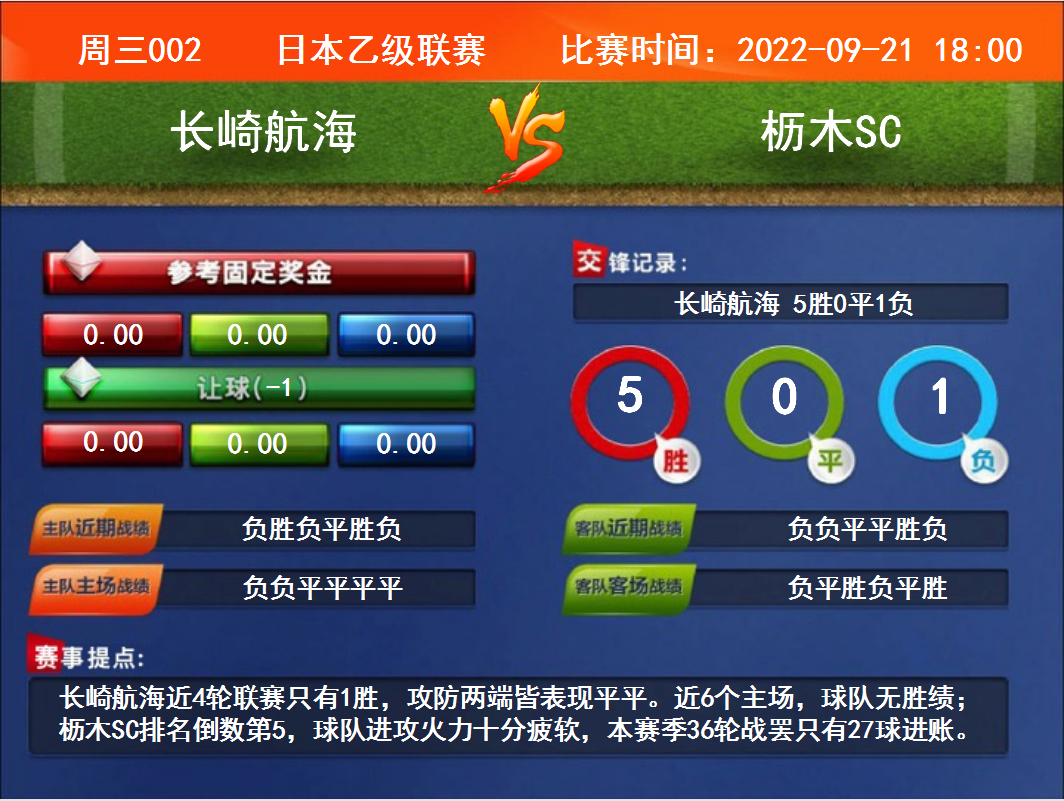 周三002 日本乙級(jí)聯(lián)賽 長(zhǎng)崎航海VS櫪木SC