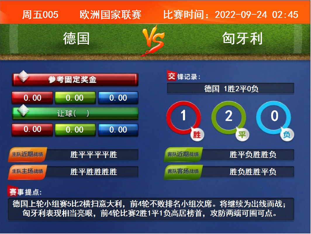 比賽時間:2022-09-24 02:45賽事提點:德國上輪小組賽5比2橫掃意大利,前4輪不敗排名小組次席。將繼續(xù)為出線而戰(zhàn);匈牙利表現(xiàn)相當(dāng)亮眼,前4輪比賽2勝1平1負高居榜首,攻防兩端可圈可點。