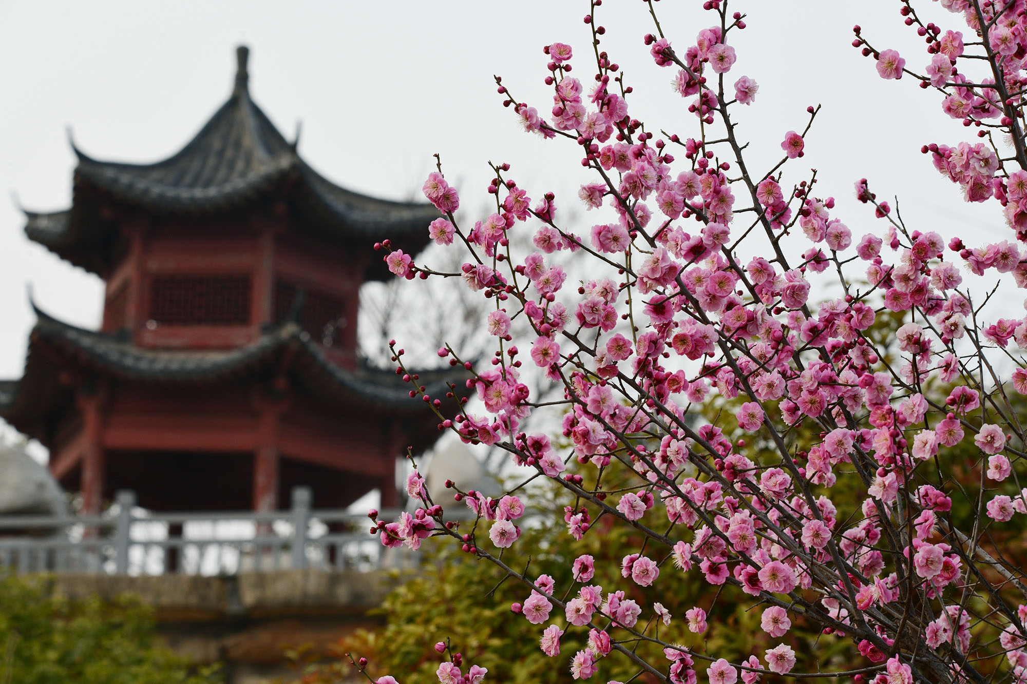 紅梅掩映的周口公園湖中廊橋