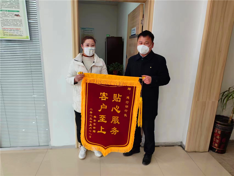 “項城蓮花大道支行的工作人員服務(wù)熱情,辦事靠譜,處處為我們著想,錢存在這里,我十分放心!”2月12日,項城市單女士為建行周口分行項城蓮花大道支行送來一面寫有“客戶至上 貼心服務(wù)”的錦旗, 對蓮花大道支行全體工作人員的熱情高效、認真負責(zé)的工作態(tài)度表示認可和感謝。單女士十分感激地把錦旗遞給了項城蓮花大道支行負責(zé)人胡洋洋,并為其點贊。