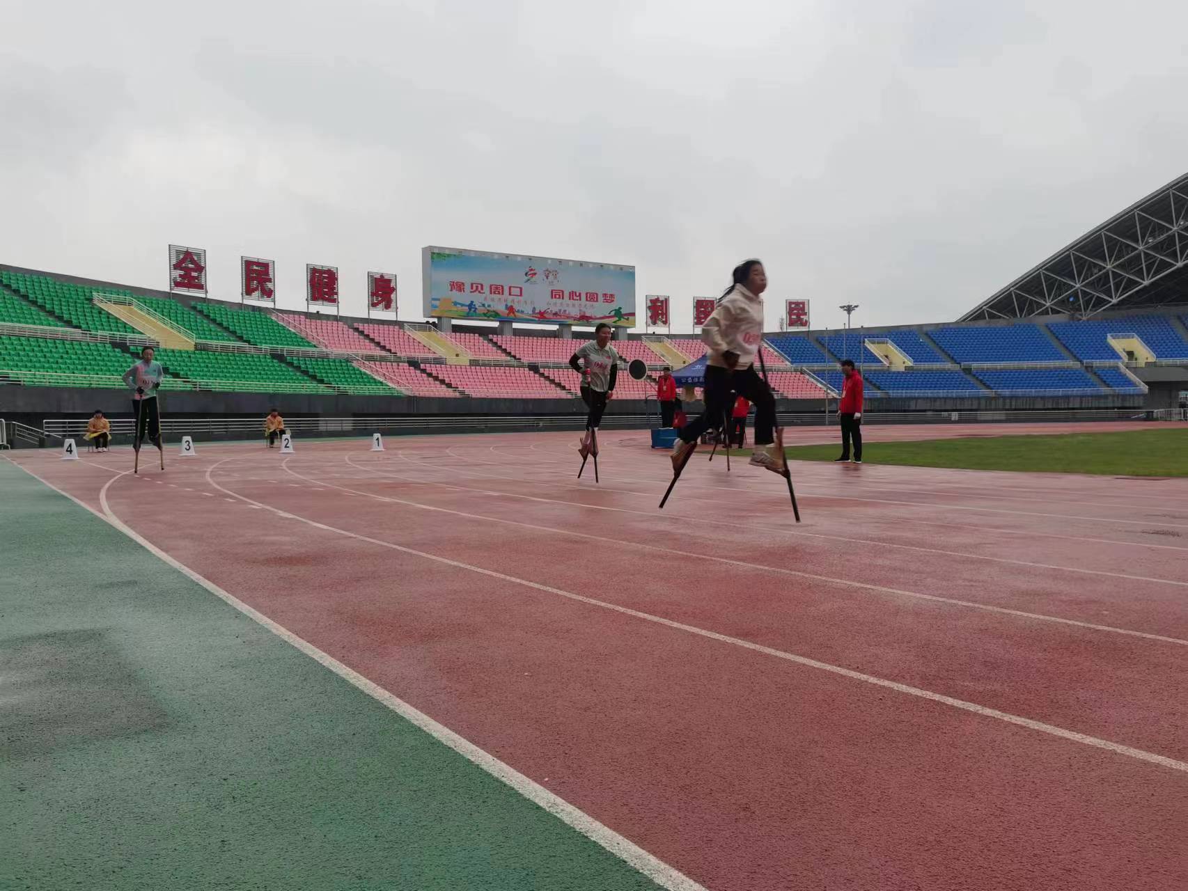 4月23日,河南省第九屆少數(shù)民族傳統(tǒng)體育運(yùn)動(dòng)會(huì)高腳競速項(xiàng)目預(yù)賽在周口體育中心田徑場開賽。隨著裁判一聲哨響,運(yùn)動(dòng)員們腳踩30多厘米的竹馬如離弦之箭向終點(diǎn)飛奔,他們在高腳馬上進(jìn)行著速度和力量的比拼。