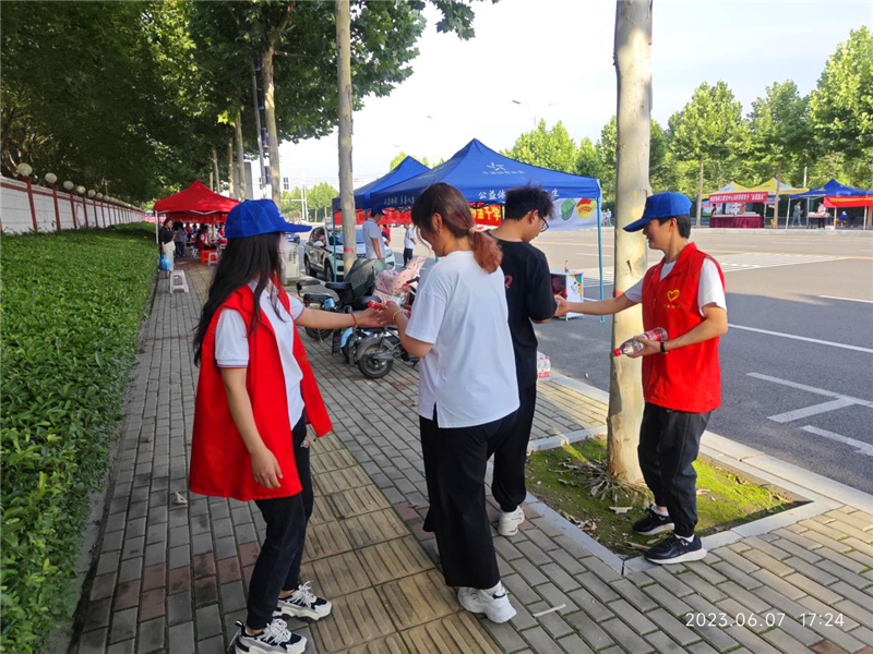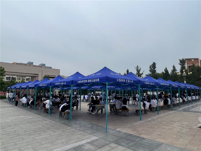 本次活動周口體彩分中心協(xié)調(diào)到40余頂帳篷,在考場外設(shè)置服務(wù)點(diǎn)為考生及家長提供飲用水、歇息區(qū)。結(jié)合周口市文昌中學(xué)實(shí)際情況,在考場校園內(nèi)搭設(shè)一整片體彩遮陽帳篷陰涼區(qū)域,為考生候場提供一片“清涼”。 與此同時,體彩志愿者熱情地為考生及家長提供愛心服務(wù),送上一瓶瓶清涼的礦泉水,帶著滿滿的愛心與祝福,給莘莘學(xué)子們加油助威,讓他們切身感受到體彩人的擔(dān)當(dāng)和真摯的關(guān)愛。