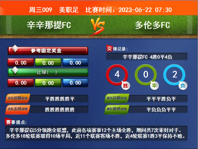 比賽時(shí)間:2023-06-22 07:30賽事提點(diǎn):辛辛那提以5分領(lǐng)跑全聯(lián)盟,此前各項(xiàng)賽事12個(gè)主場全勝,期間共7次零封對手。多倫多18輪聯(lián)賽取得10場平局,近11個(gè)聯(lián)賽客場不勝,近4輪聯(lián)賽1勝3平保持不敗。