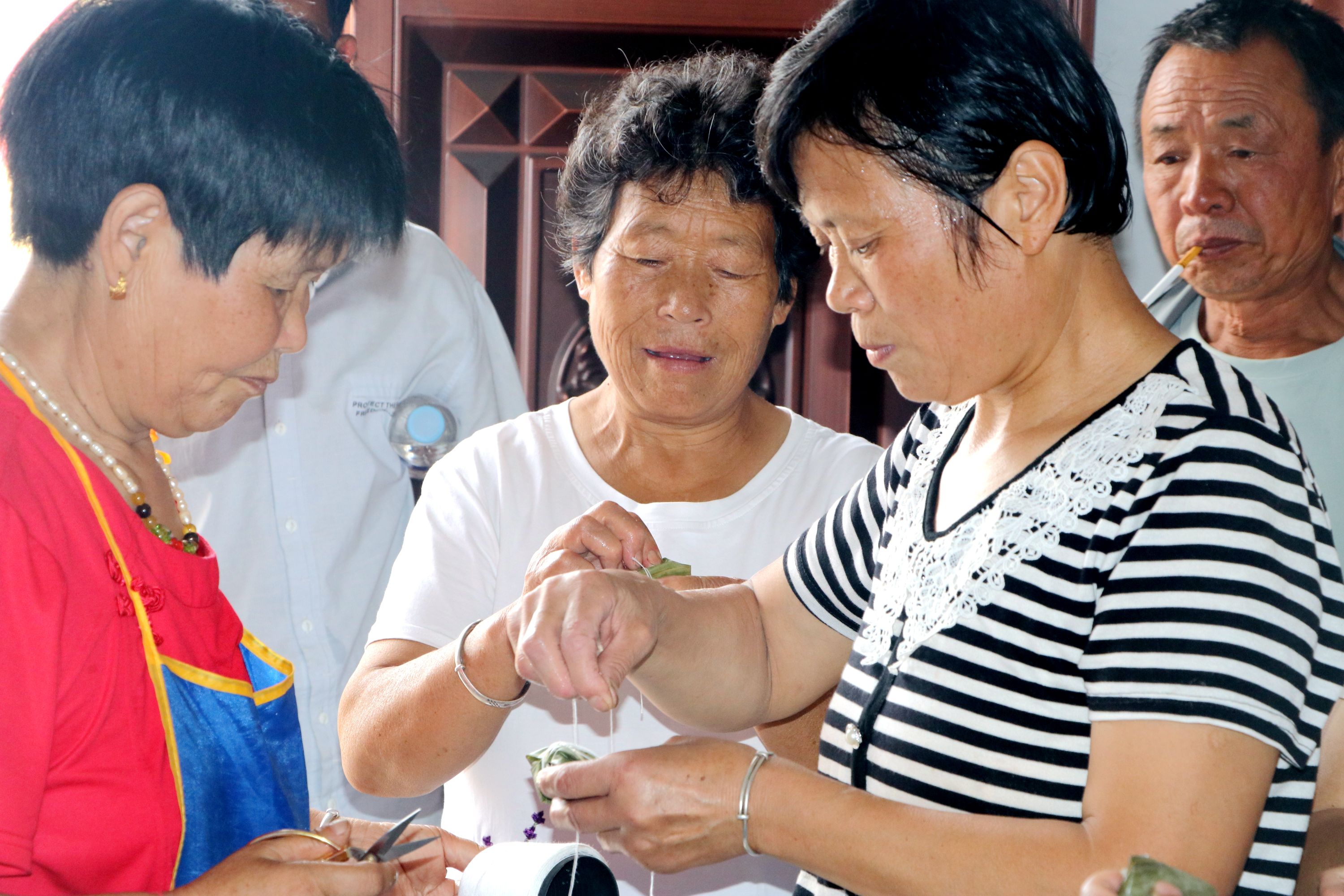 一大早,宋福利就組織村“兩委”成員將泡好的糯米、紅豆、蜜棗、粽葉等材料整齊地擺放在桌子上,做好包粽子準備工作?;顒右婚_始,大家就迅速進入包粽子狀態(tài),圍在一起,使出看家本領,捋粽葉、做漏斗狀、填糯米、壓緊實、封口、扎捆……在粽葉翻飛、米香四溢中,翠綠的粽葉和晶瑩的糯米在一雙雙巧手中瞬間變成了一個個清香誘人的粽子。大家一邊包粽子,一邊嘮家常,說著、笑著,一片融洽和諧。經(jīng)過1個多小時的辛勤勞作,粽子包好了,宋福利和老人們把包好的粽子分成若干份,送給村里行走不便的低保戶、獨居老人、“五?!崩先耍⑴c他們進行交談,了解他們近期的生活情況,叮囑他們保重身體。