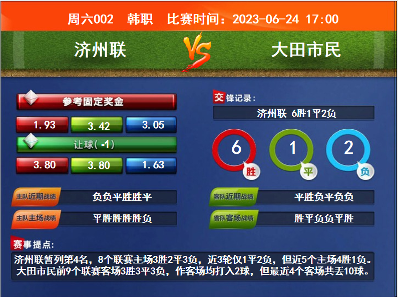 比賽時間:2023-06-24 17:00賽事提點:濟(jì)州聯(lián)暫列第4名,8個聯(lián)賽主場3勝2平3負(fù),近3輪僅1平2負(fù),但近5個主場4勝1負(fù)。大田市民前9個聯(lián)賽客場3勝3平3負(fù),作客場均打入2球,但最近4個客場共丟10球。
