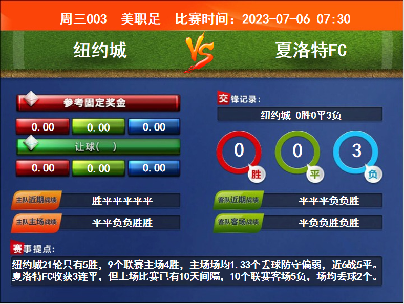 比賽時(shí)間:2023-07-06 07:30賽事提點(diǎn):紐約城21輪只有5勝,9個(gè)聯(lián)賽主場(chǎng)4勝,主場(chǎng)場(chǎng)均1.33個(gè)丟球防守偏弱,近6戰(zhàn)5平。夏洛特FC收獲3連平,但上場(chǎng)比賽已有10天間隔,10個(gè)聯(lián)賽客場(chǎng)5負(fù),場(chǎng)均丟球2個(gè)。